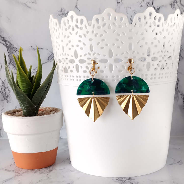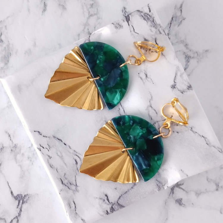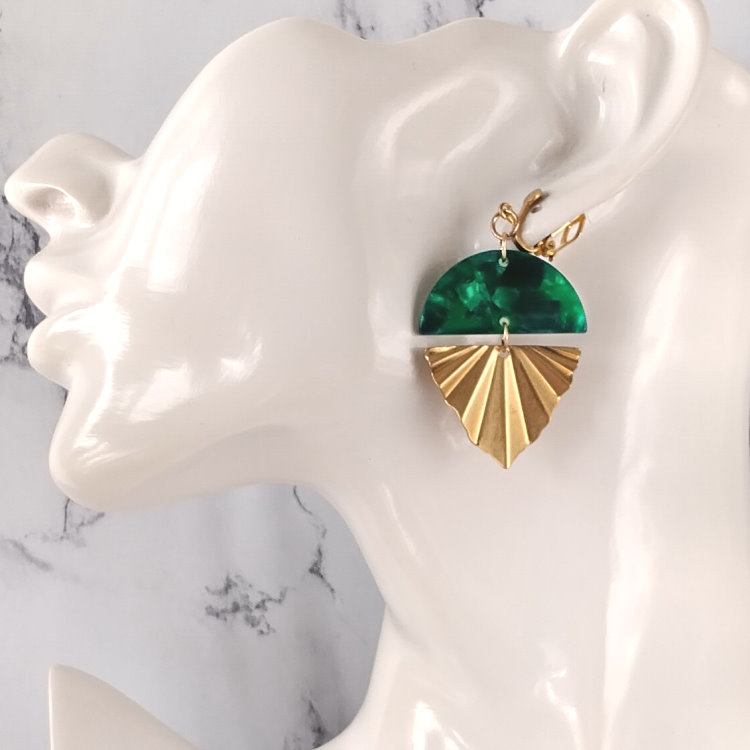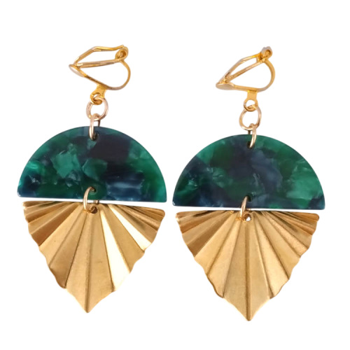 Boucles d'oreilles clips pendantes éventail doré triangle texturé plissé et demi-rond vert marbré en résine acrylique, pour oreilles non percées. Style art africain, art abstrait.Superbe effet ! Super tendance, chic et moderne !Taille du pendant : 3,7 cm de hauteur Matière du pendant : Laiton et résine acryliqueMatière des clips : Laiton plaqué