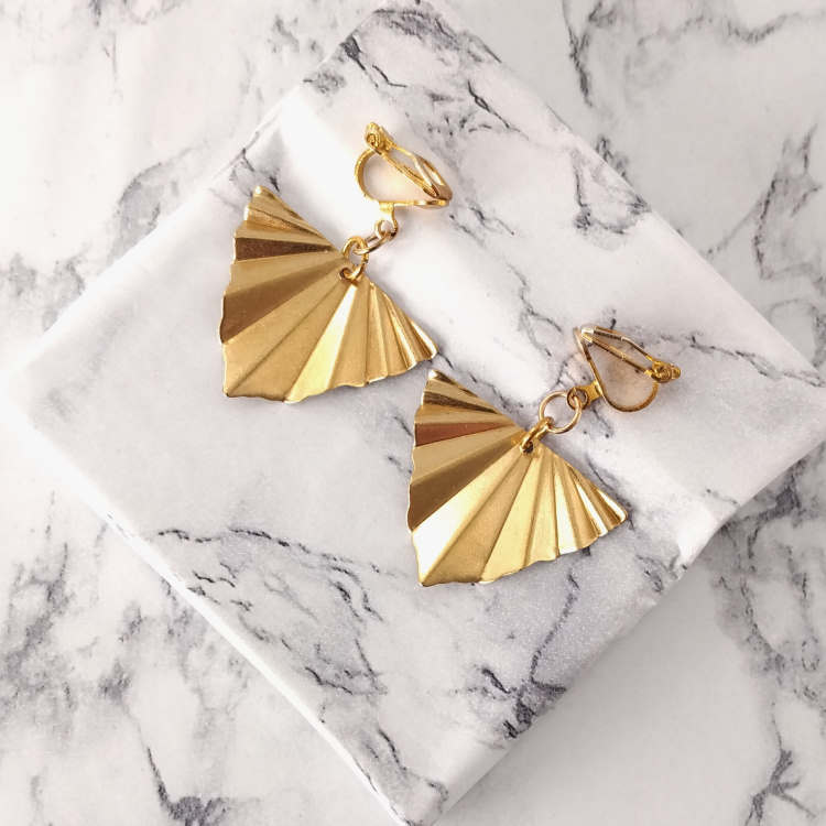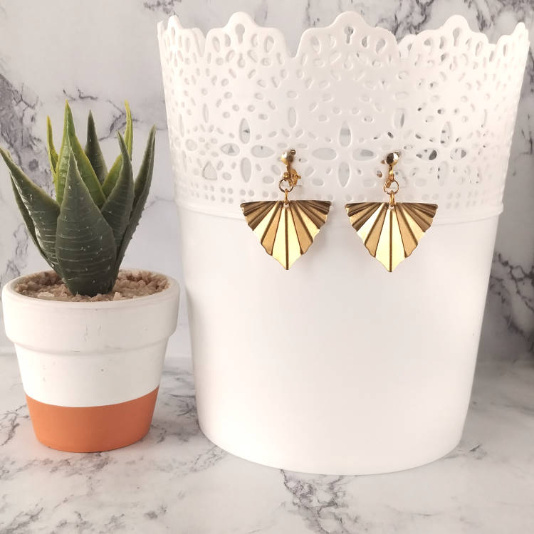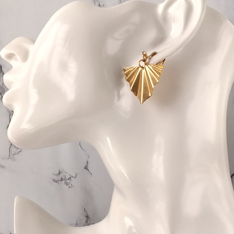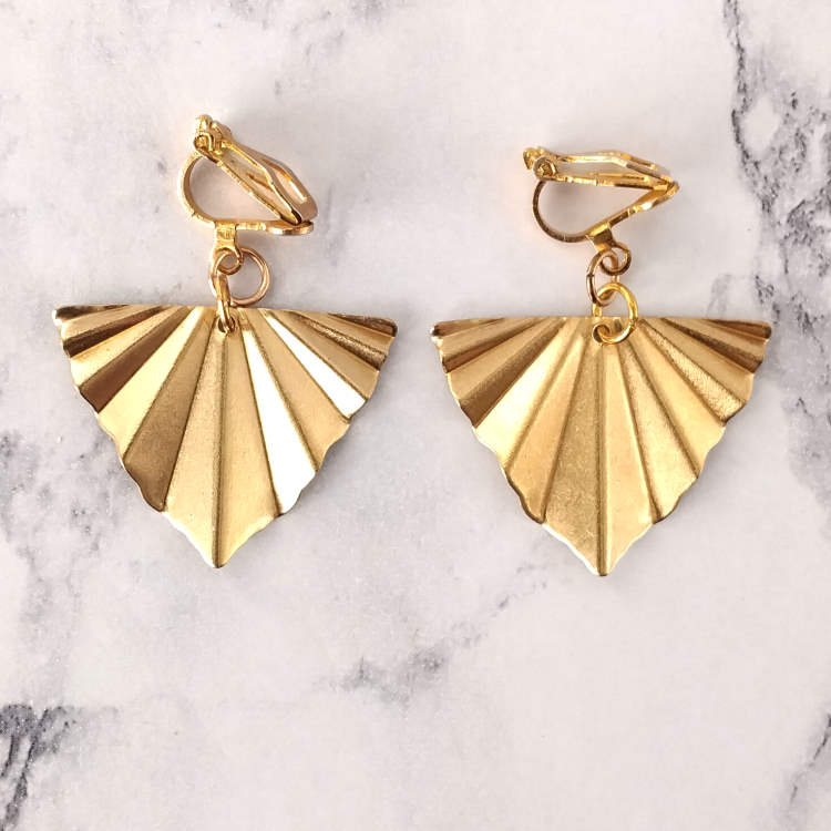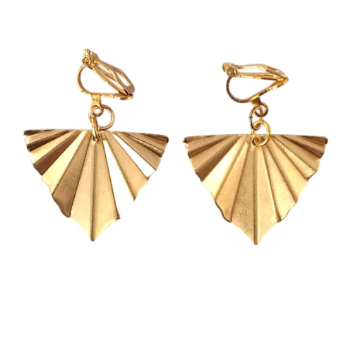 Boucles d'oreilles clips pendantes éventail doré triangle texturé plissé, pour oreilles non percées. Style art africain, art abstrait.Superbe effet ! Super tendance, chic et moderne !Taille du pendant : 2,2 cm de hauteur Matière du pendant : LaitonMatière des crochets : Laiton plaqué