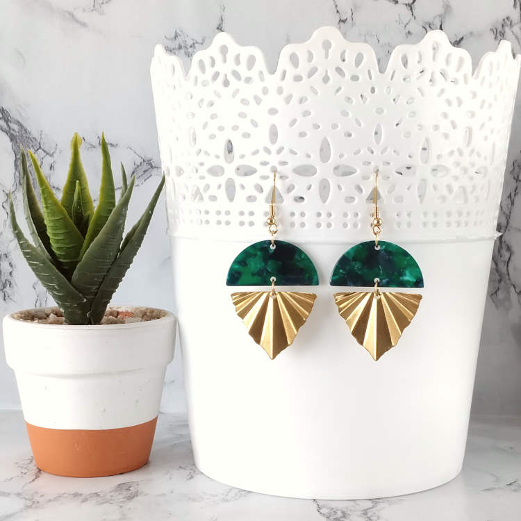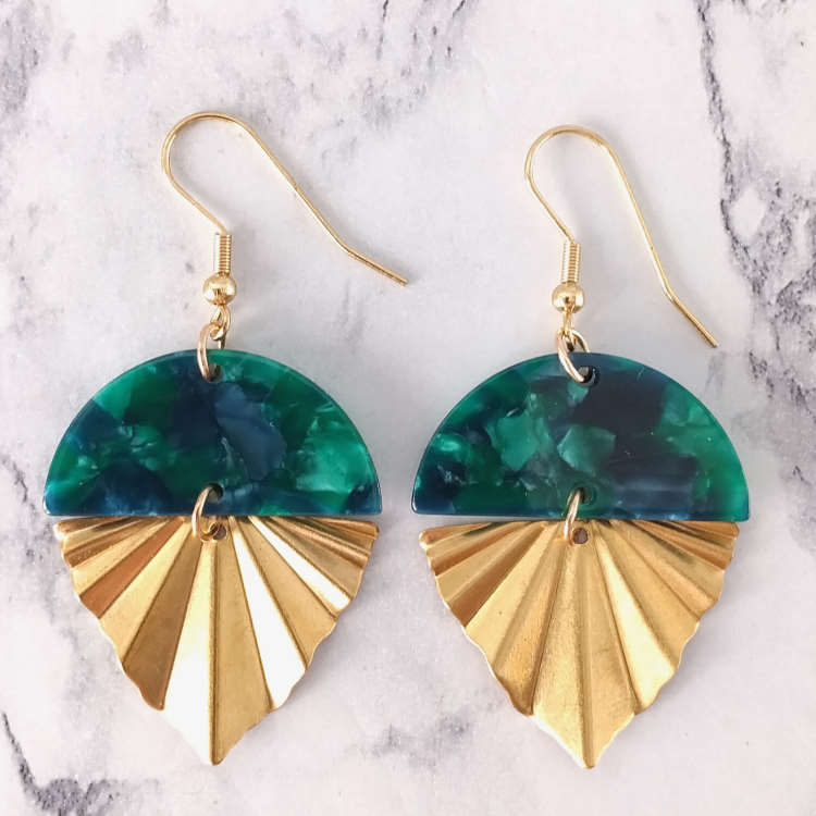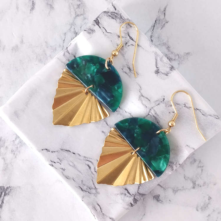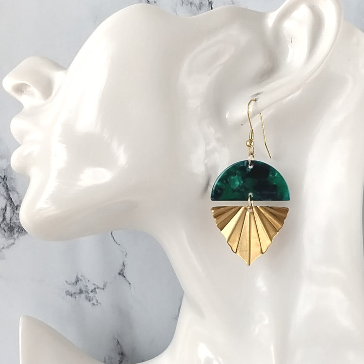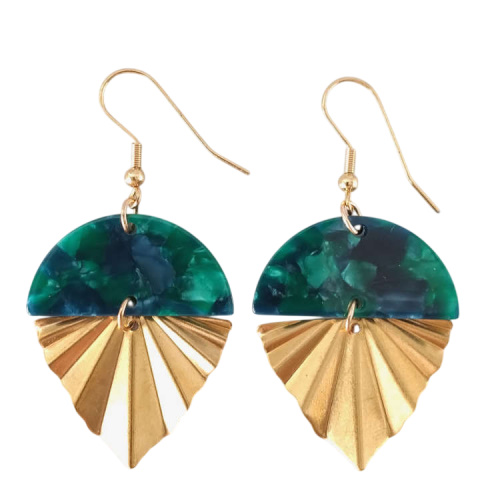 Boucles d'oreilles pendantes éventail doré triangle texturé plissé et demi-rond vert effet marbré en résine acrylique, pour oreilles percées. Style art africain, art abstrait.Superbe effet ! Super tendance, chic et moderne !Taille du pendant : 3,7 cm de hauteur Matière du pendant : Laiton et résine acryliqueMatière des crochets : Acier inoxydable