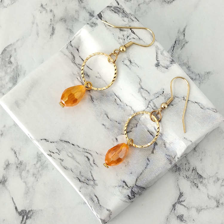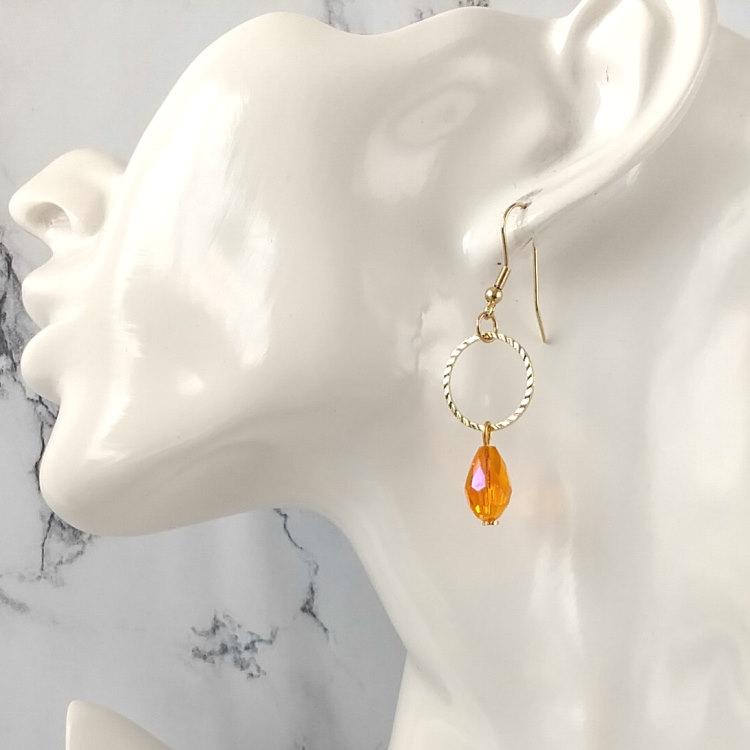 Boucles d'oreilles pendantes anneau rond cercle doré texturé et perle orange facettée en forme de goutte, pour oreilles percées. Style ethnique et moderne.Taille du pendant : 3 cm de hauteur Matière du pendant : Laiton plaqué et verreMatière des crochets : Acier inoxydable