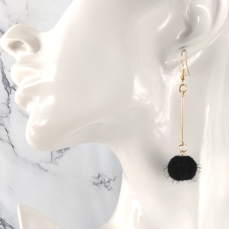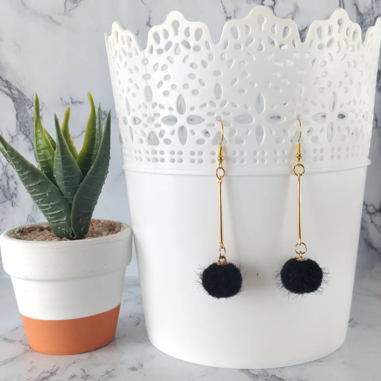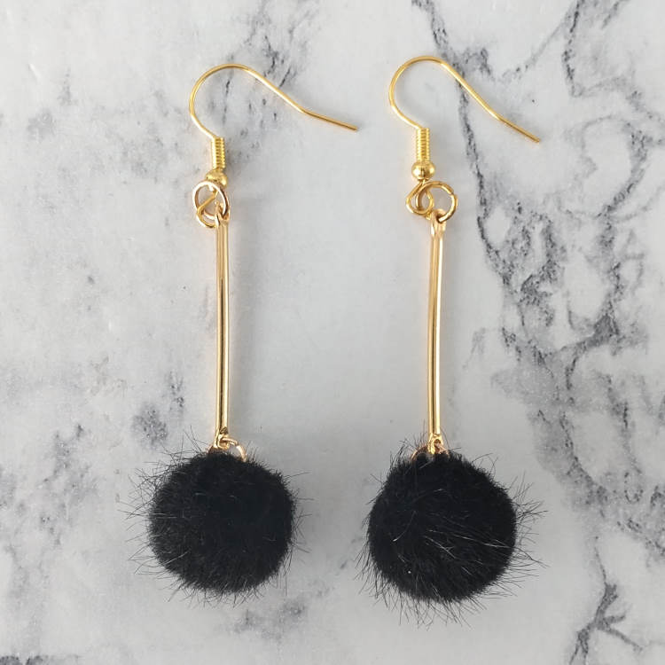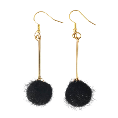 Boucles d'oreilles pendantes balancier avec pompon rond noir et tige dorée, pour oreilles percées. Style vintage rétro art déco pour un look tendance.Taille du pendant : 4,5 cm de hautMatière du pendant : Acrylique et laiton plaqué Matière des crochets : Acier inoxydable