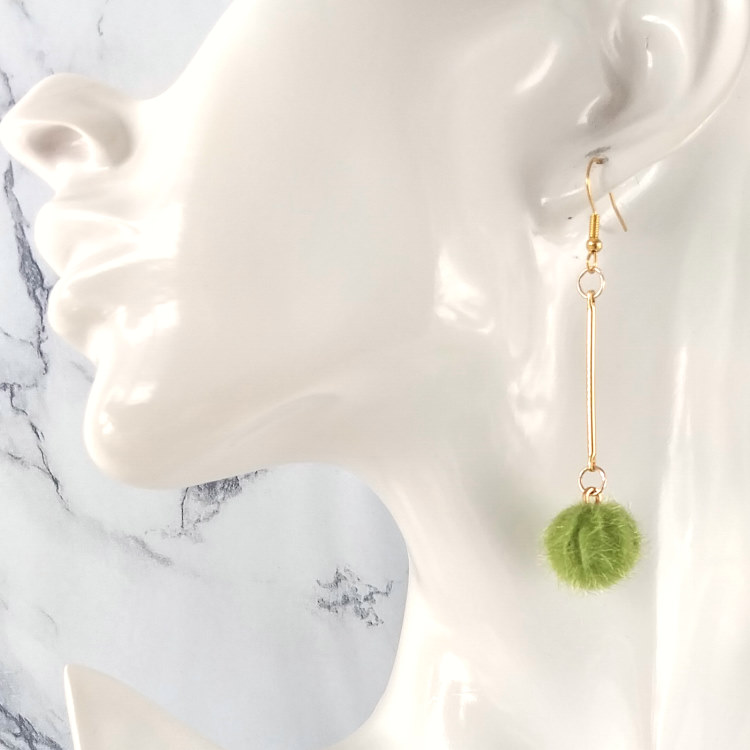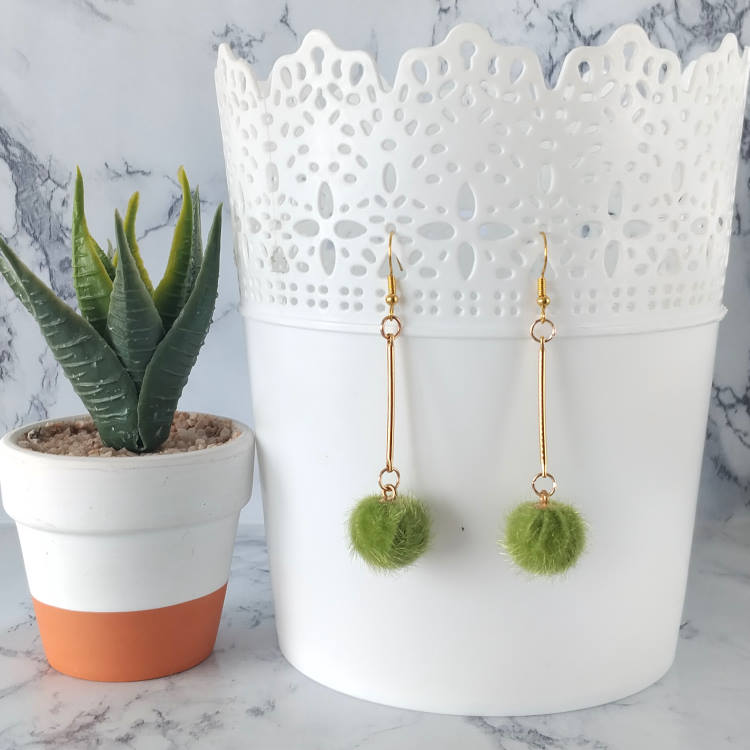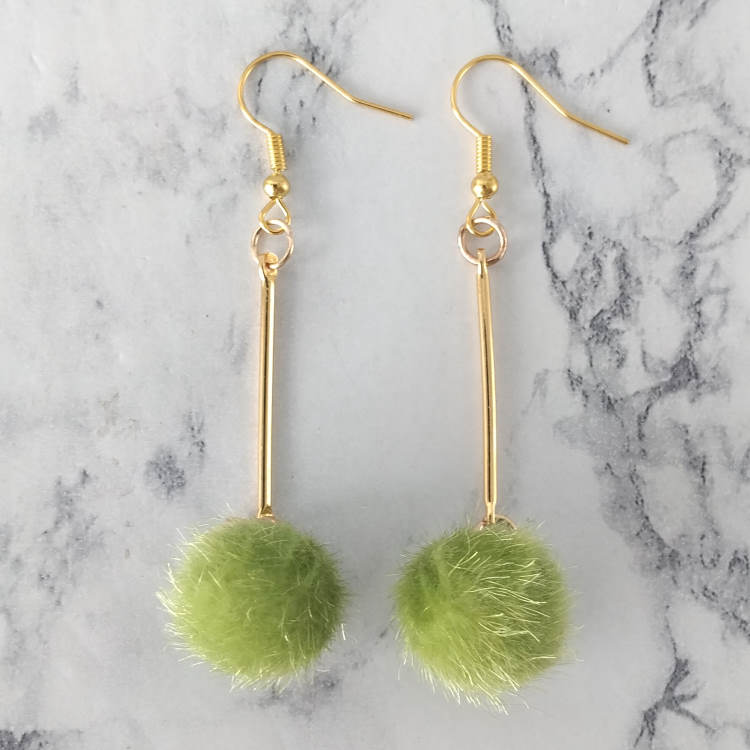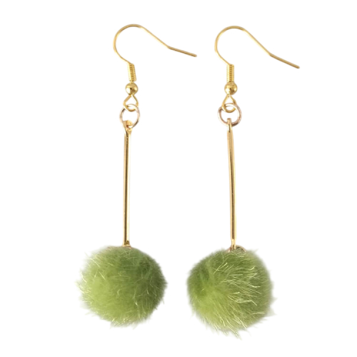 Boucles d'oreilles pendantes balancier avec pompon rond vert et tige dorée, pour oreilles percées. Style vintage rétro art déco pour un look tendance.Taille du pendant : 4,5 cm de hautMatière du pendant : Acrylique et laiton plaqué Matière des crochets : Acier inoxydable