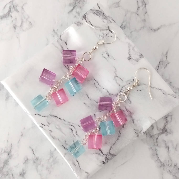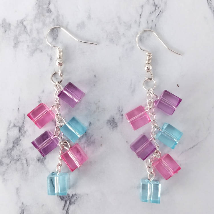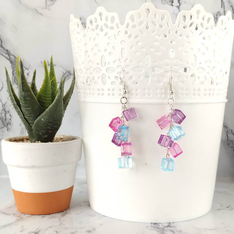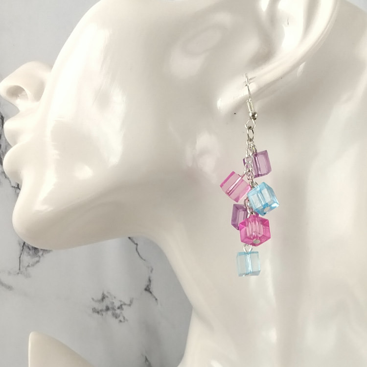Boucles d'oreilles pendantes chaine grappe de cubes carrés colorés bleu rose violet pour oreilles percées. Style vintage rétro pour un look tendance.Taille du pendant : 5 cm de haut Matière du pendant : AcryliqueMatière des crochets : Acier inoxydable