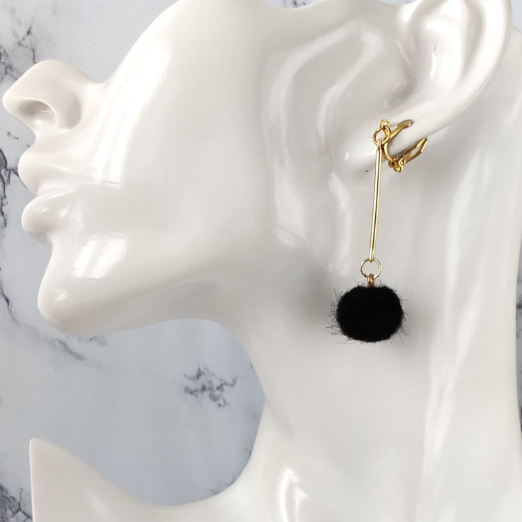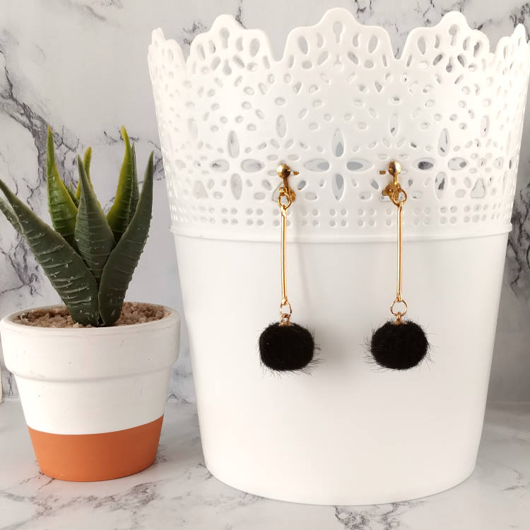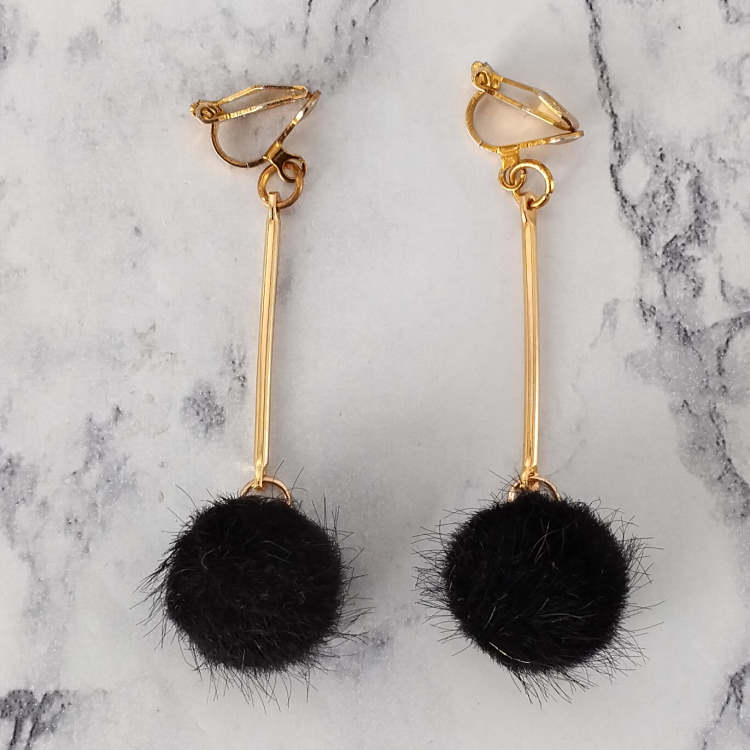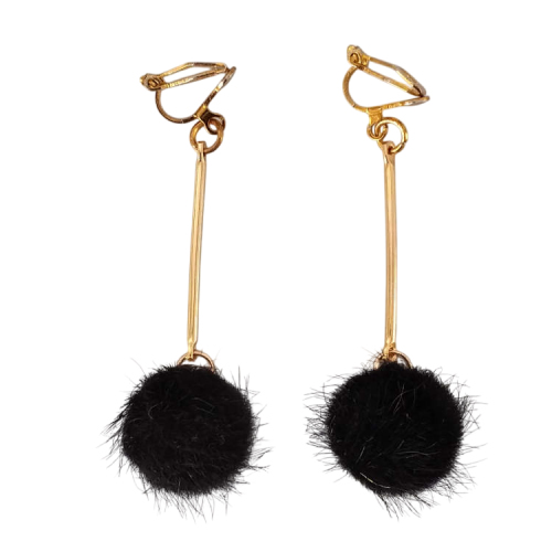 Boucles d'oreilles clips pendantes balancier avec pompon rond noir et tige dorée, pour oreilles non percées. Style vintage rétro art déco pour un look tendance.Taille du pendant : 4,5 cm de hautMatière du pendant : Acrylique et laiton plaqué Matière des clips : Laiton
