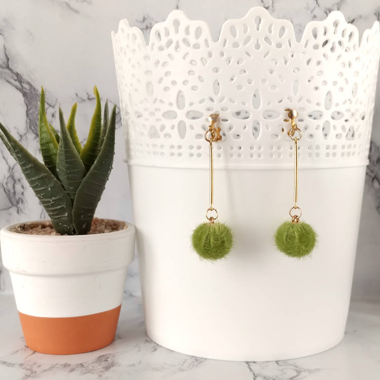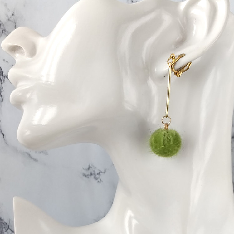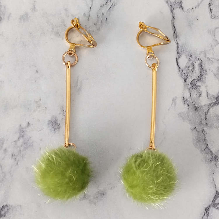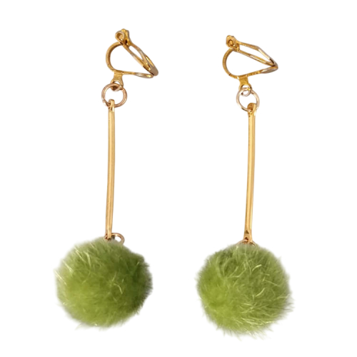 Boucles d'oreilles clips pendantes balancier avec pompon rond vert et tige dorée, pour oreilles non percées. Style vintage rétro art déco pour un look tendance.Taille du pendant : 4,5 cm de hautMatière du pendant : Acrylique et laiton plaqué Matière des clips : Laiton
