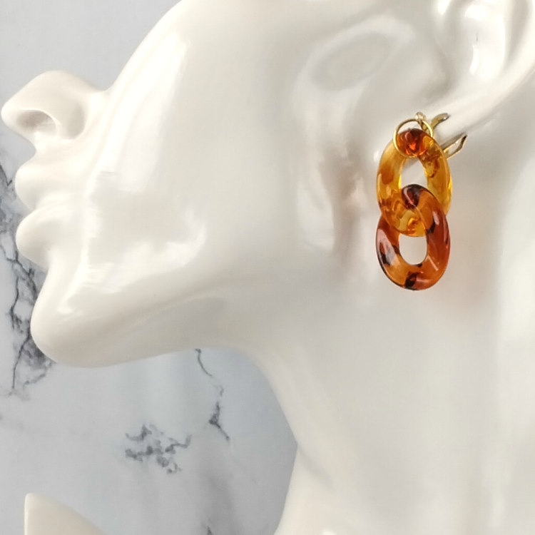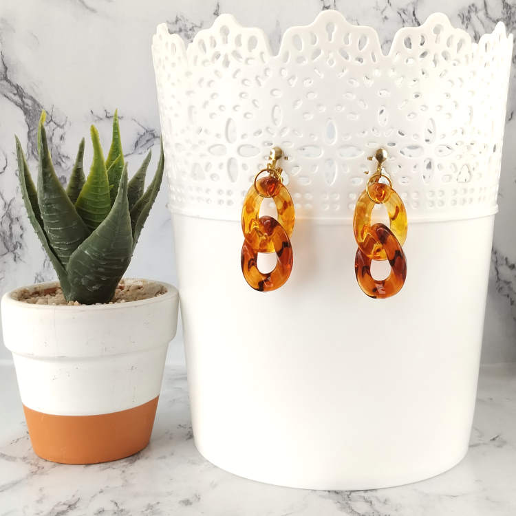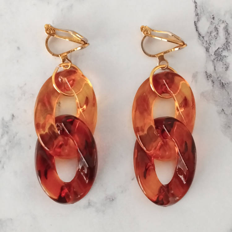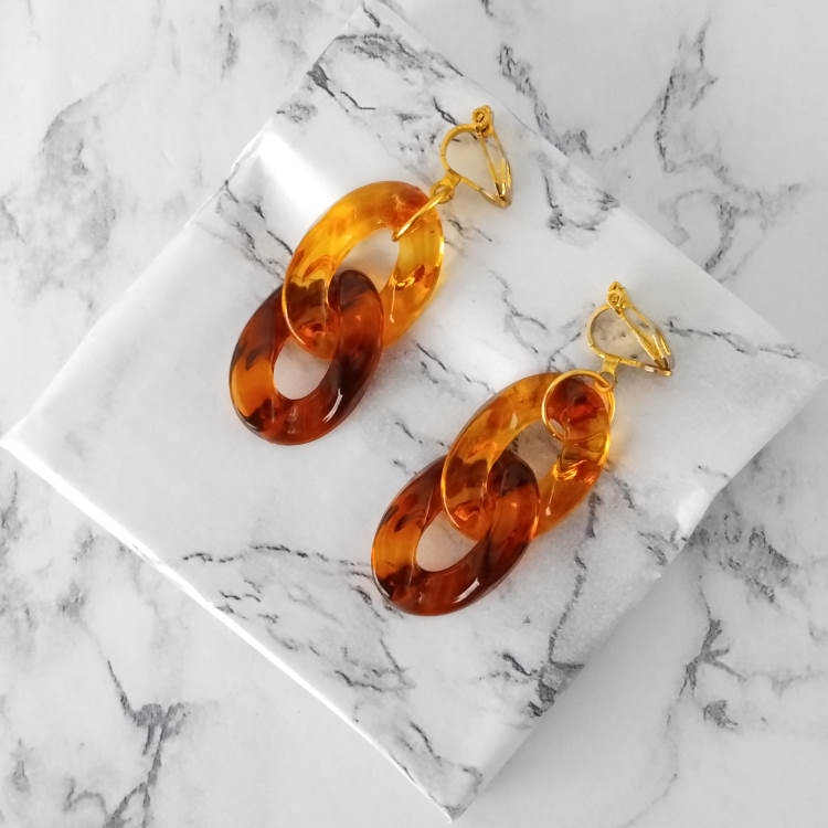 Boucles d'oreilles pendantes à clips chaine effet ambré deux maillons, pour oreilles non percées. Style moderne.Superbe effet ! Super tendance !Taille du pendant : 3,5 cm de haut. Matière du pendant : AcryliqueMatière des clips : Métal