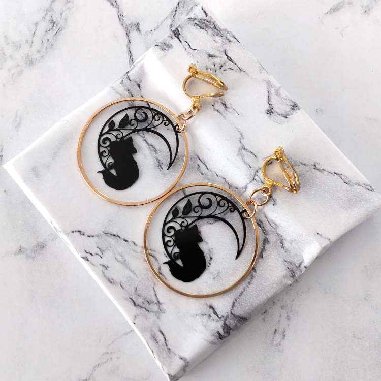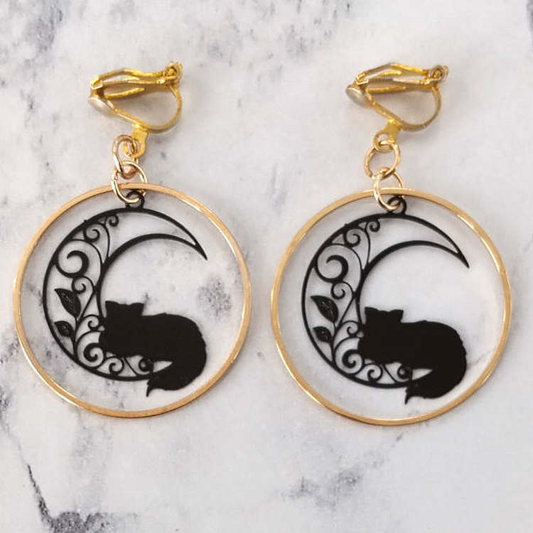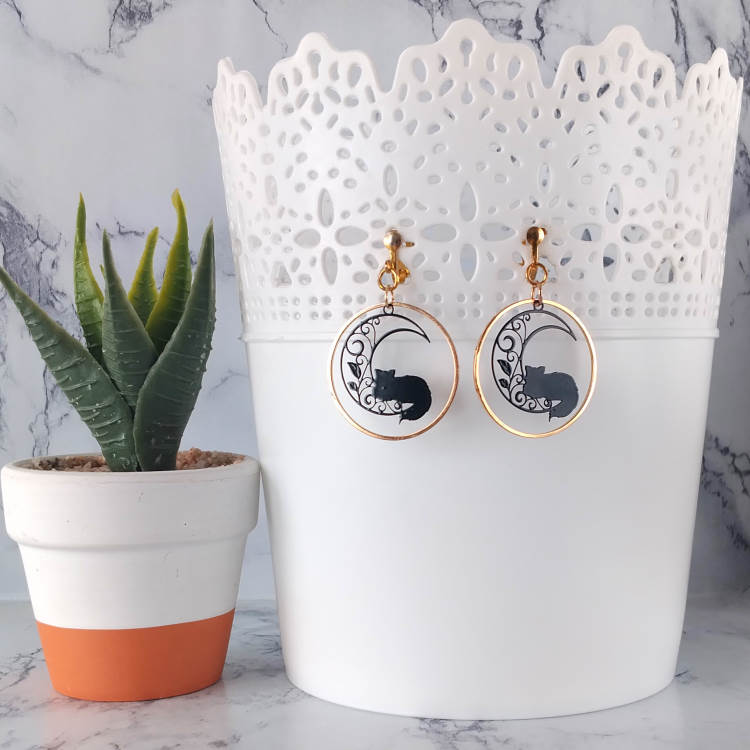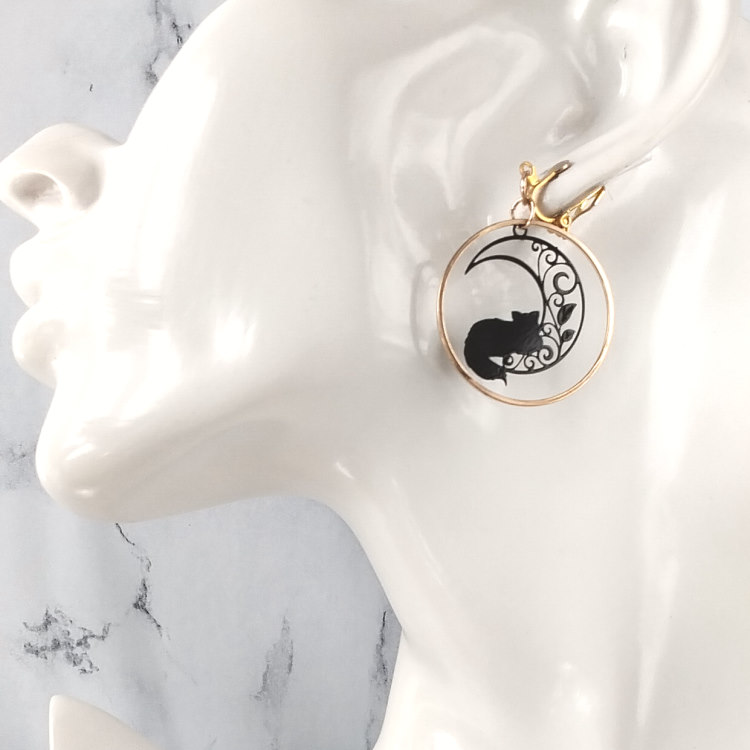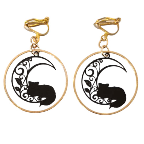 Boucles d'oreilles clips pendantes chat et lune filigrane noir dans un cercle doré, pour oreilles non percées. Taille du pendant : 3 cm de haut Matière du pendant : Métal et laiton plaquéMatière des clips : Laiton