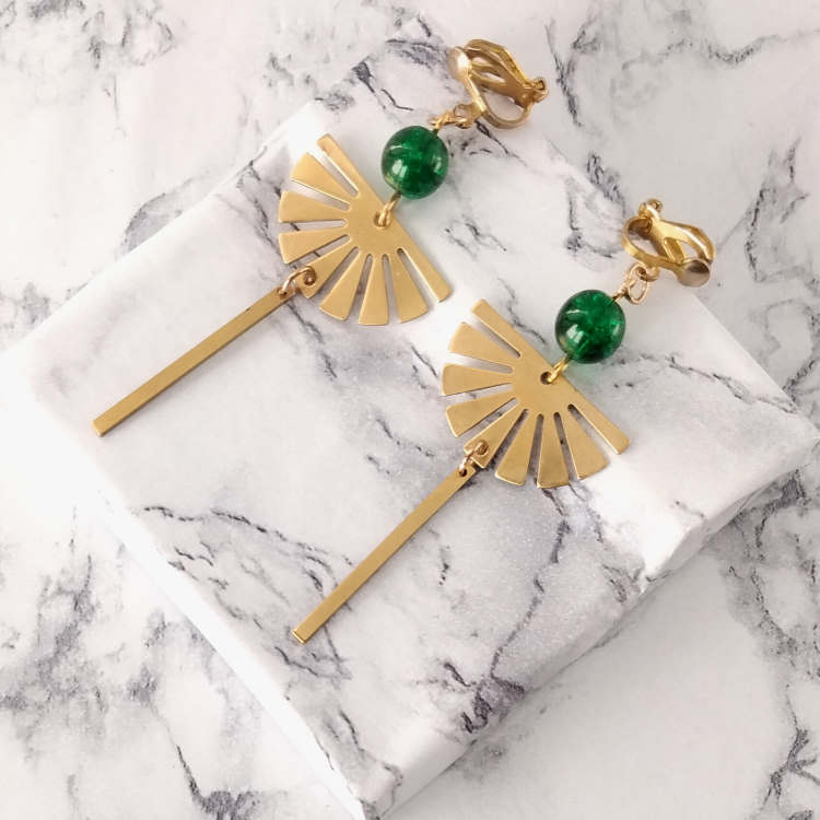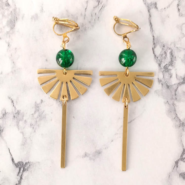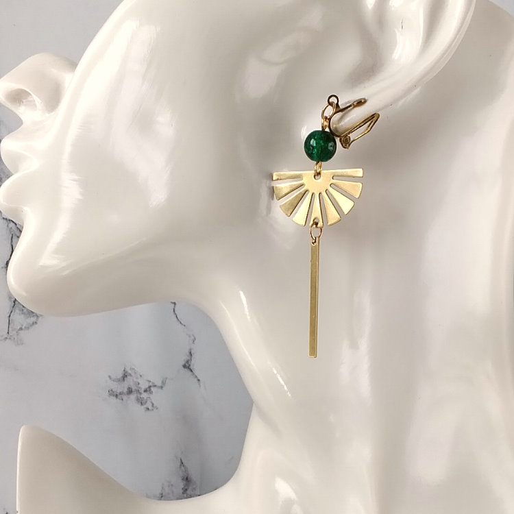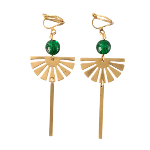 Boucles d'oreilles clips longues demi-soleil doré avec perle verte irisée et tige rectangulaire pendante, pour oreilles non percées. Style ethnique et moderne.Taille du pendant : 6 cm de hauteur Matière du pendant : LaitonMatière des clips : Laiton