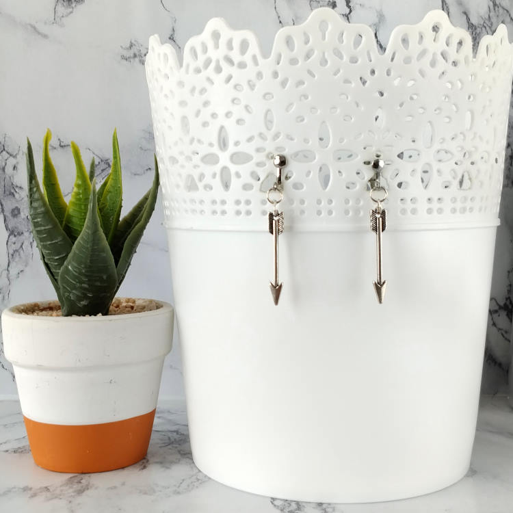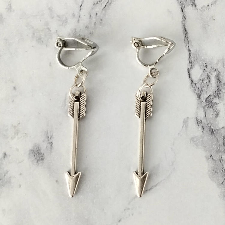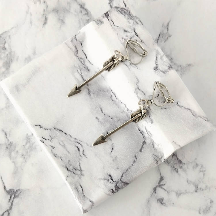 Boucles d'oreilles pendantes à clips avec flèche argentée, pour oreilles non percées. Superbe effet ! Original !Taille du pendant : 3 cm de haut. Matière du pendant : MétalMatière des clips : Métal