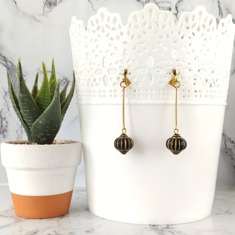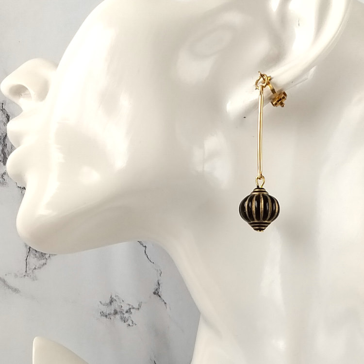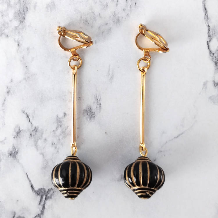 Boucles d'oreilles clips pendantes perle en forme de lampion japonais noir et tige dorée balancier, pour oreilles non percées. Style vintage rétro art déco pour un look tendance.Taille du pendant : 4,5 cm de hautMatière du pendant : Acrylique et laiton plaqué Matière des clips : Laiton
