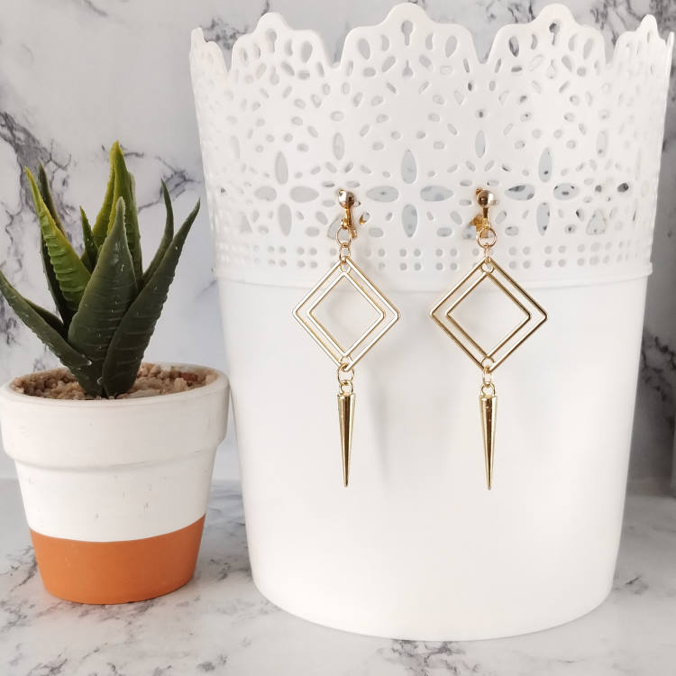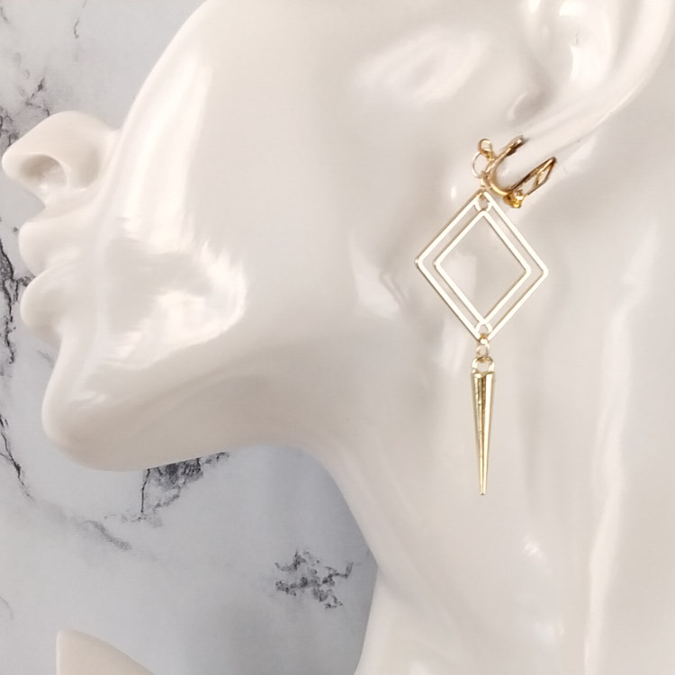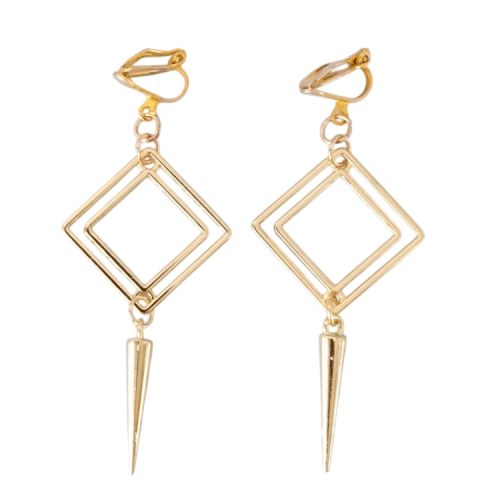 Boucles d'oreilles clips losange doré et pointe pendante, pour oreilles non percées. Style ethnique et moderne.Taille du pendant : 5,2 cm de hauteur Matière du pendant : Laiton plaquéMatière des clips : Laiton