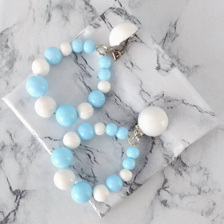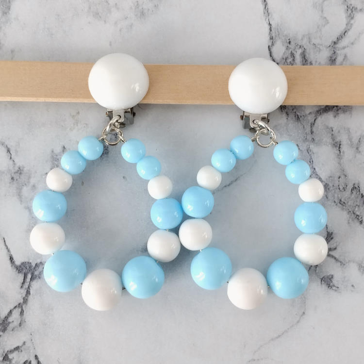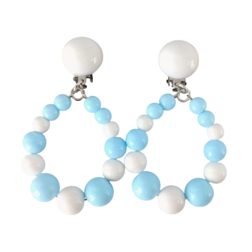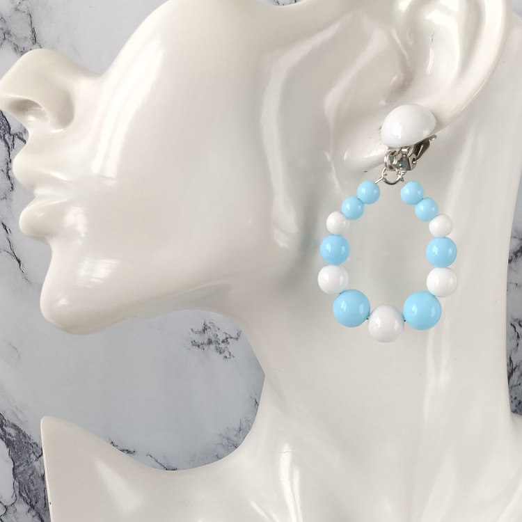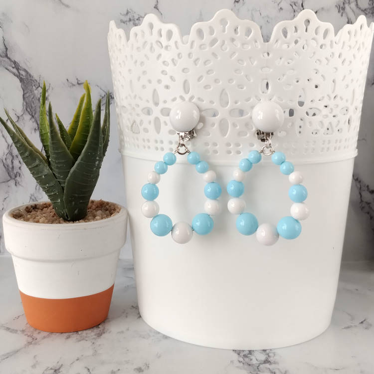 Boucles d'oreilles pendantes à clips avec perles blanches et bleues rondes de différentes tailles qui forment une goutte pendante et cabochon assorti, pour oreilles non percées. Style bohème.Super tendance !Taille du pendant : 4,2 cm de hauteur. 3,5 cm de largeur.Matière du pendant : Résine acrylique teintée opaqueMatière des clips : Métal et acrylique