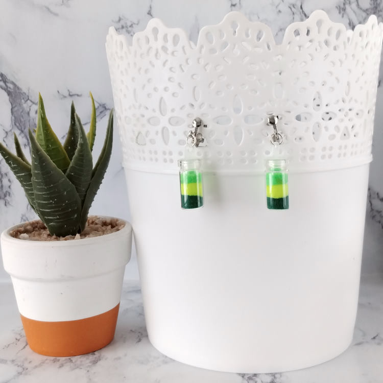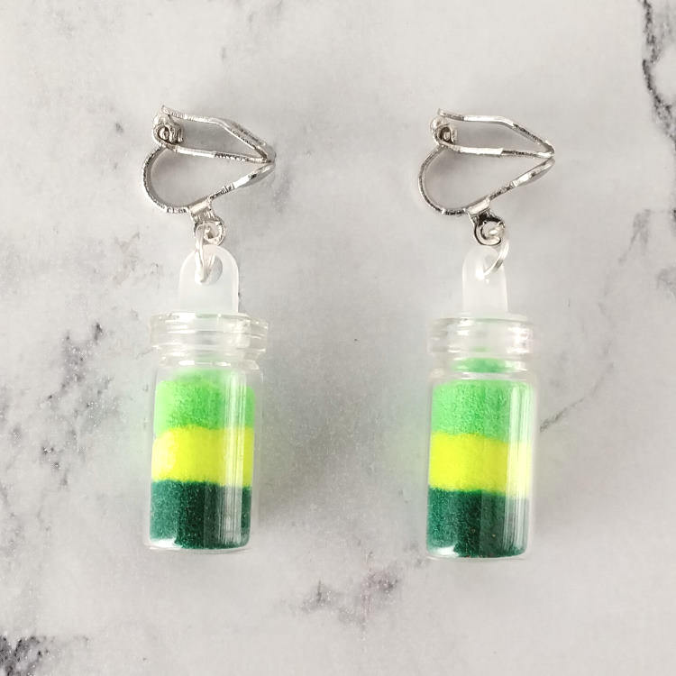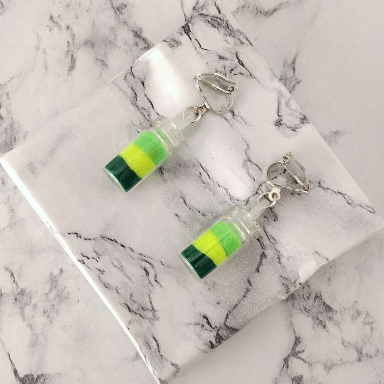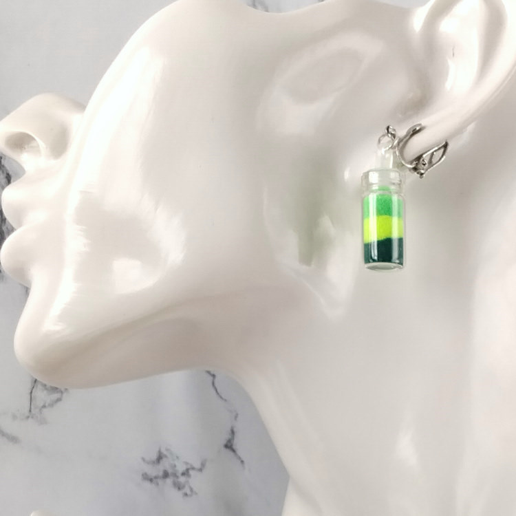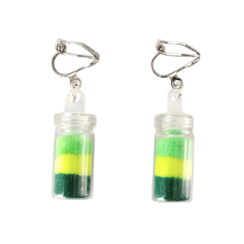 Boucles d'oreilles clips pendantes petit flacon en verre contenant trois mousses synthétiques colorées en jaune, vert clair et foncé, pour oreilles non percées. Le bouchon est en plastique. Original, mignon et amusant.Taille du pendant : 2,3 cm de hauteur. Matière du pendant : verre, mousse synthétique et plastiqueMatière des clips : Métal