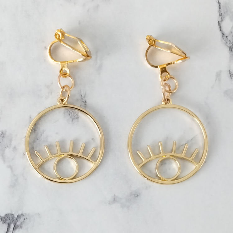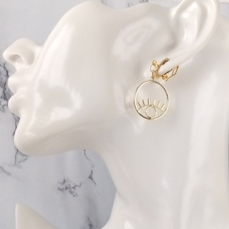 Boucles d'oreilles clips pendantes petit oeil de couleur or doré dans un cercle, pour oreilles non percées. Style Picasso art déco abstrait.Superbe effet ! Super tendance !Taille du pendant : 2,2 cm de diamètreMatière du pendant : Laiton plaquéMatière des clips : Laiton