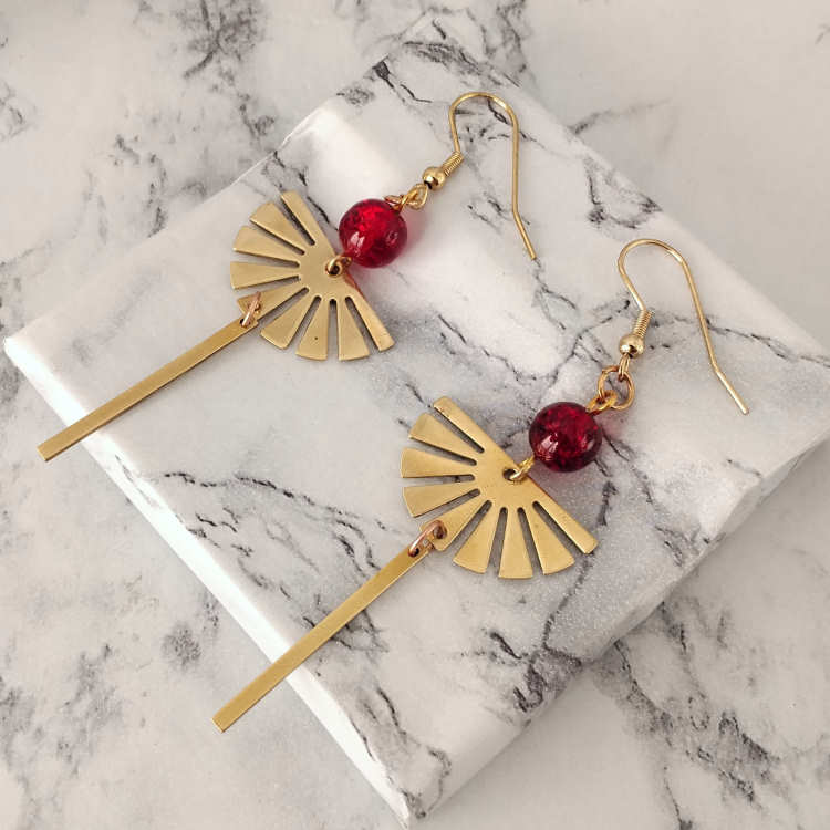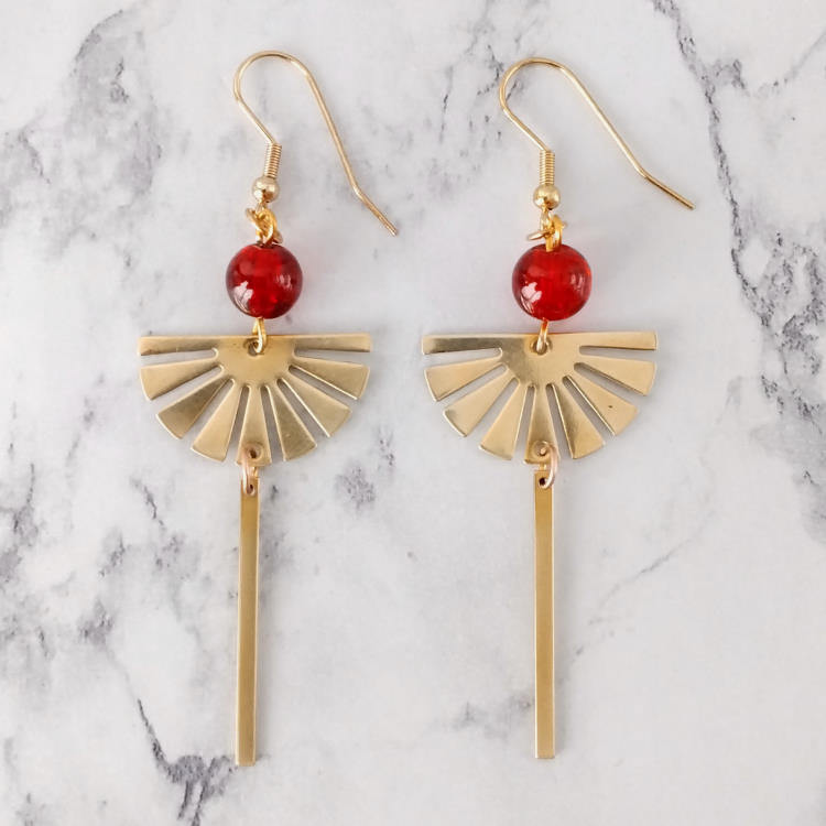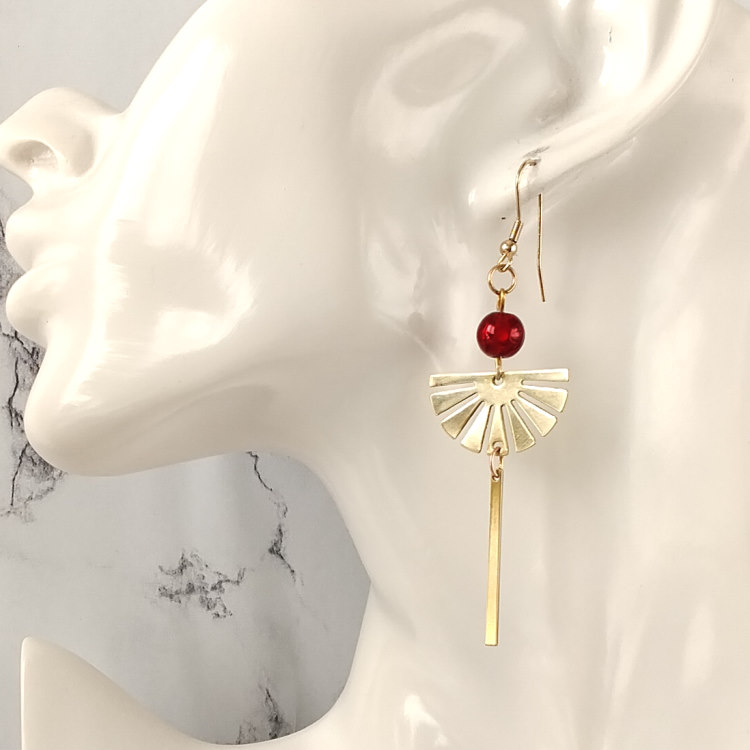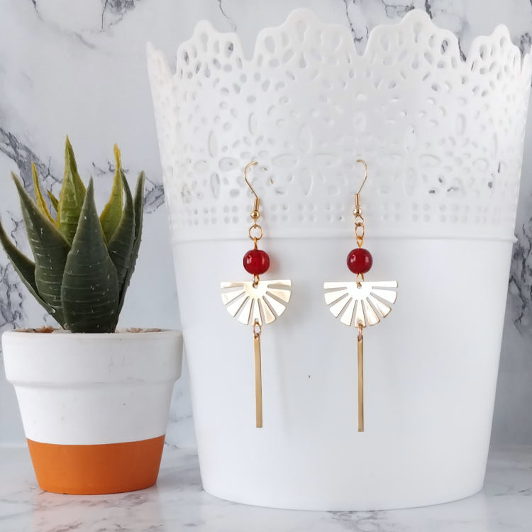 Boucles d'oreilles longues demi-soleil doré avec perle rouge irisée et tige rectangulaire pendante, pour oreilles percées. Style ethnique et moderne.Taille du pendant : 6 cm de hauteur Matière du pendant : LaitonMatière des crochets : Acier inoxydable