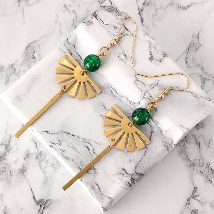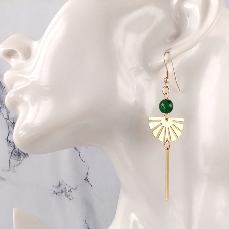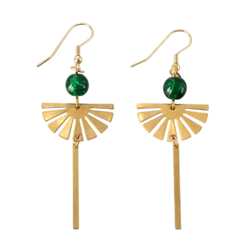 Boucles d'oreilles longues demi-soleil doré avec perle verte irisée et tige rectangulaire pendante, pour oreilles percées. Style ethnique et moderne.Taille du pendant : 6 cm de hauteur Matière du pendant : LaitonMatière des crochets : Acier inoxydable