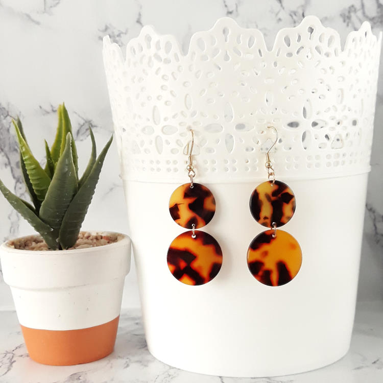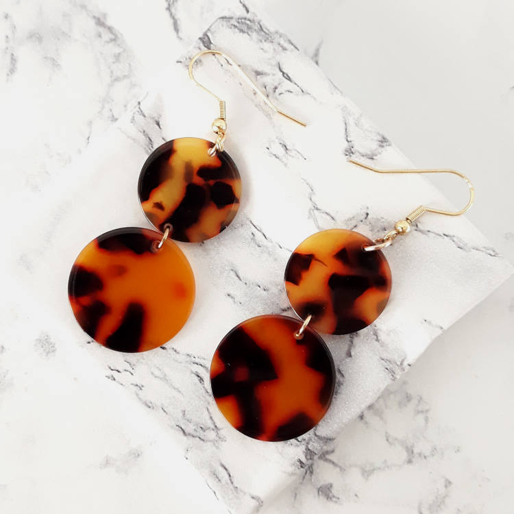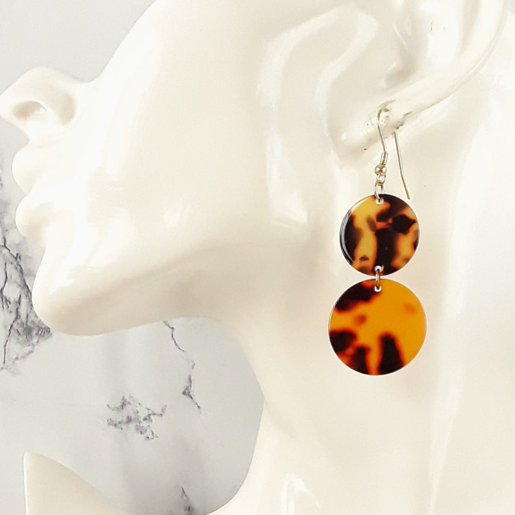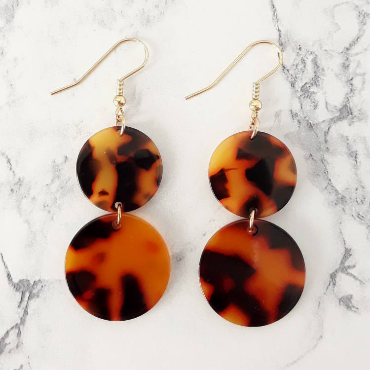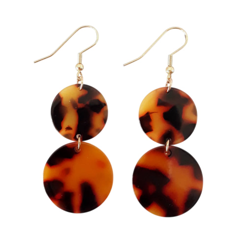 Boucles d'oreilles pendantes deux ronds de différentes tailles, en résine acrylique à motif léopard écaille de tortue doré, pour oreilles percées. Style vintage rétro.Superbe effet ! Super tendance !Taille du pendant : 4,2 cm de hautMatière du pendant : AcryliqueMatière des crochets : Métal