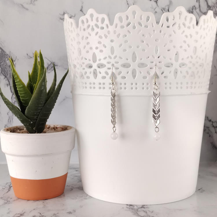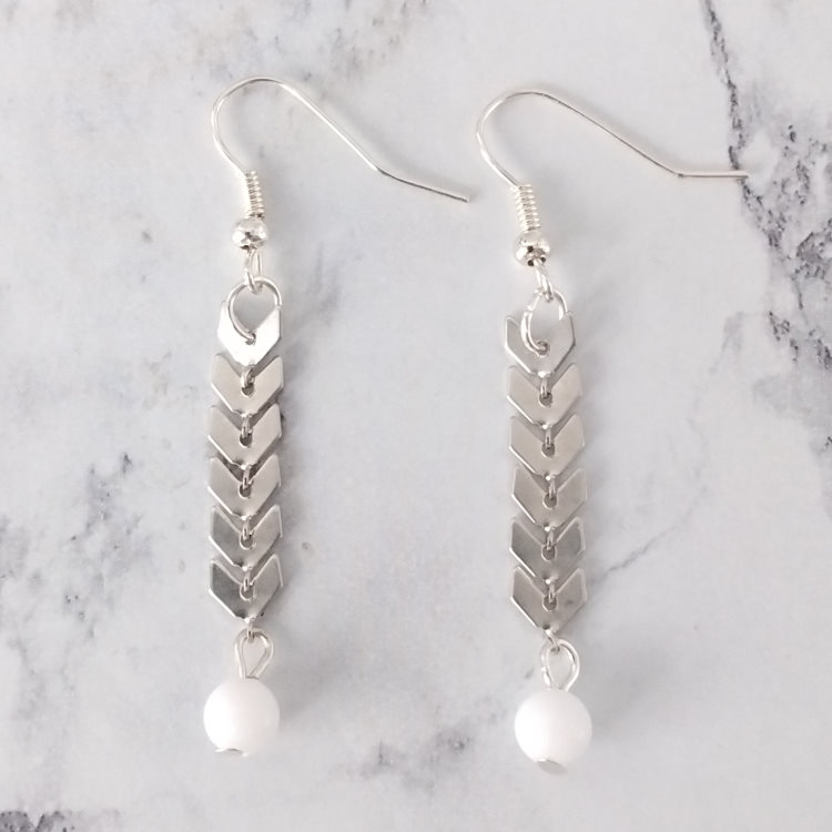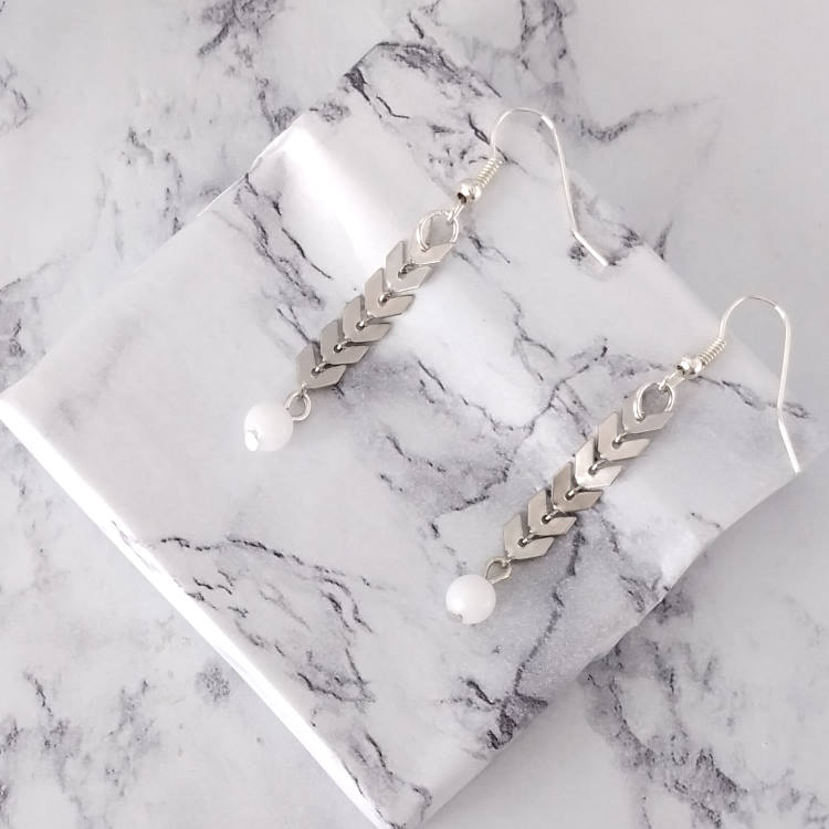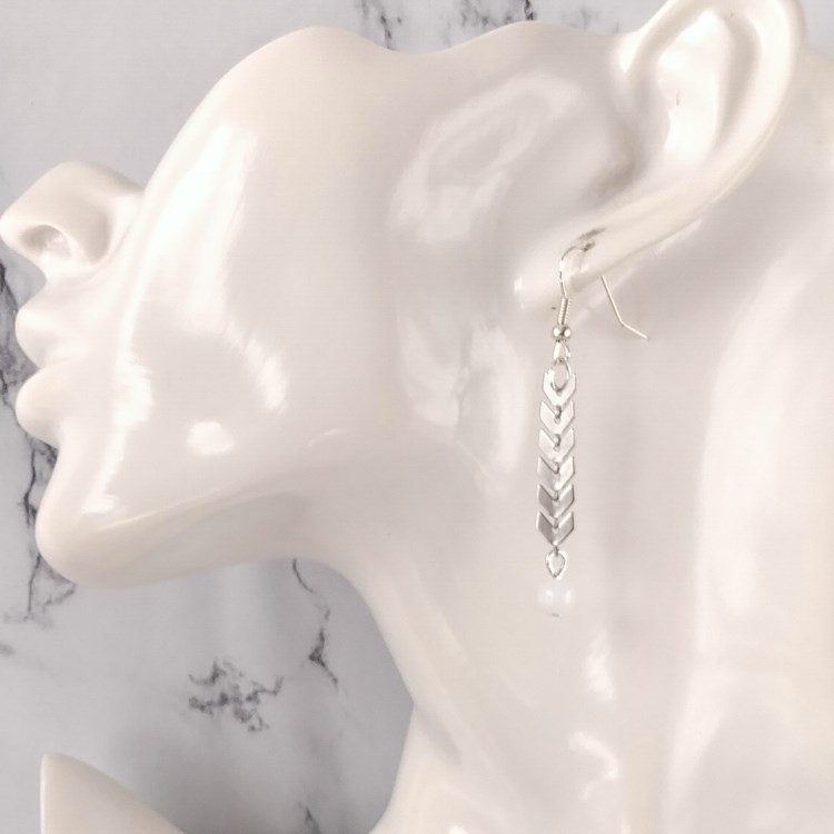 Boucles d'oreilles pendantes épis de blé argenté et petite perle blanche, pour oreilles percées. Style ethnique pour un look tendance original.Taille du pendant : 3,5 cm de haut. Matière du pendant : Métal et acryliqueMatière des crochets : Acier inoxydable