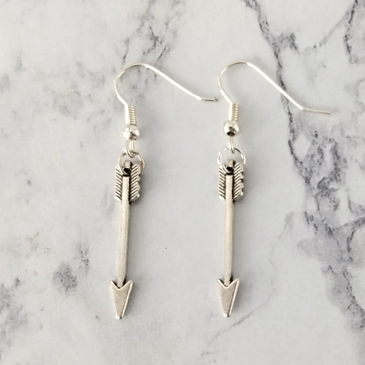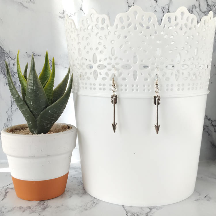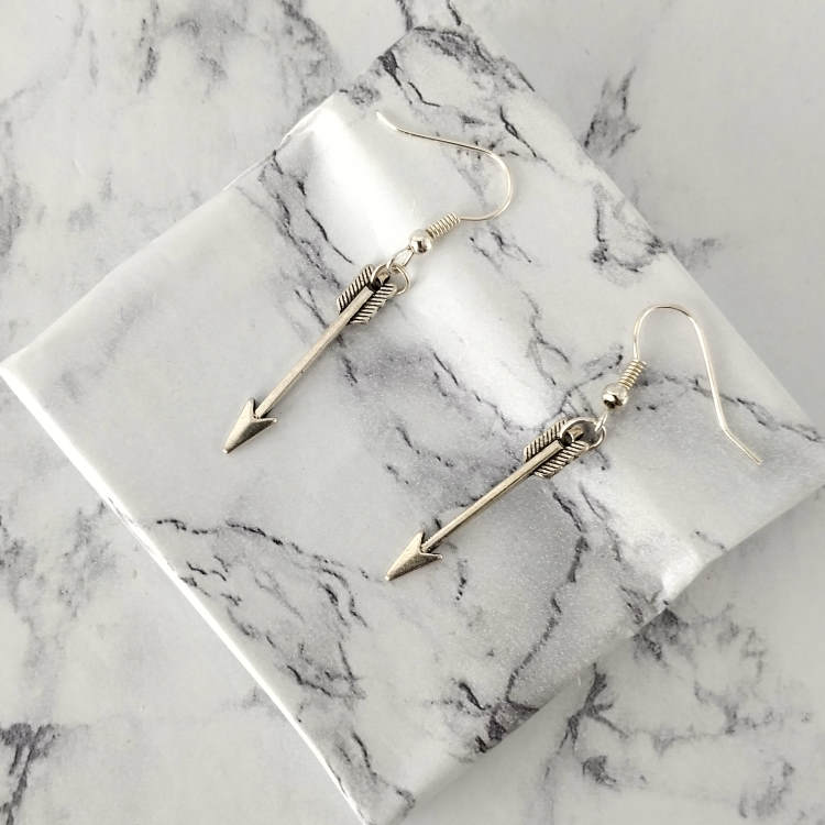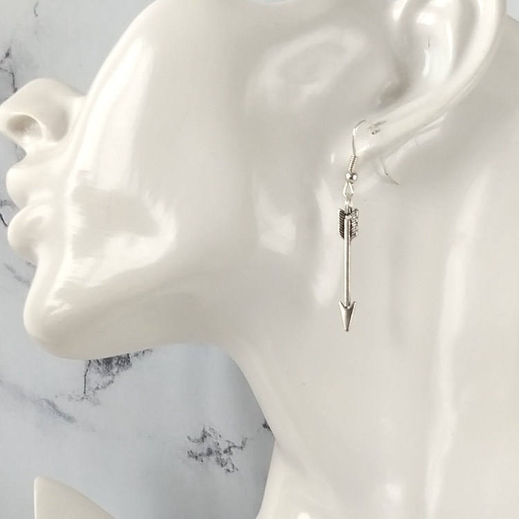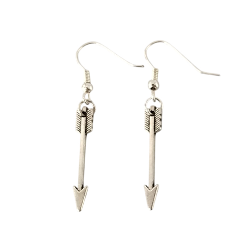 Boucles d'oreilles pendantes avec flèche argentée, pour oreilles percées. Superbe effet ! Original !Taille du pendant : 3 cm de haut. Matière du pendant : MétalMatière des crochets : Acier inoxydable