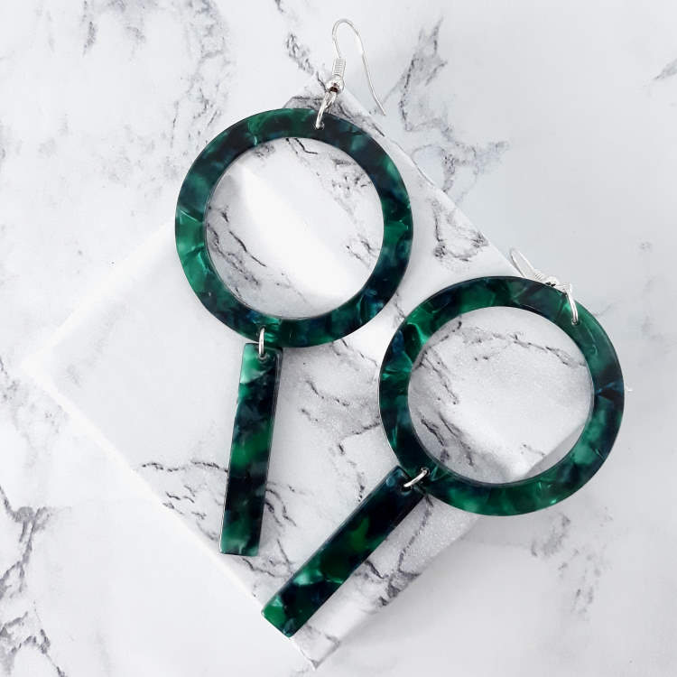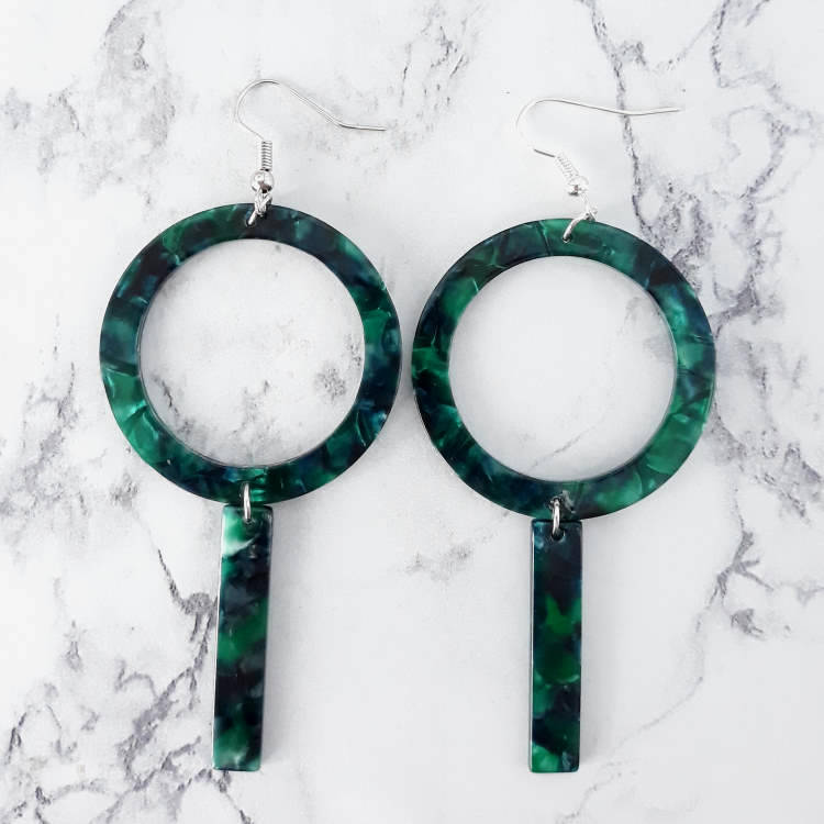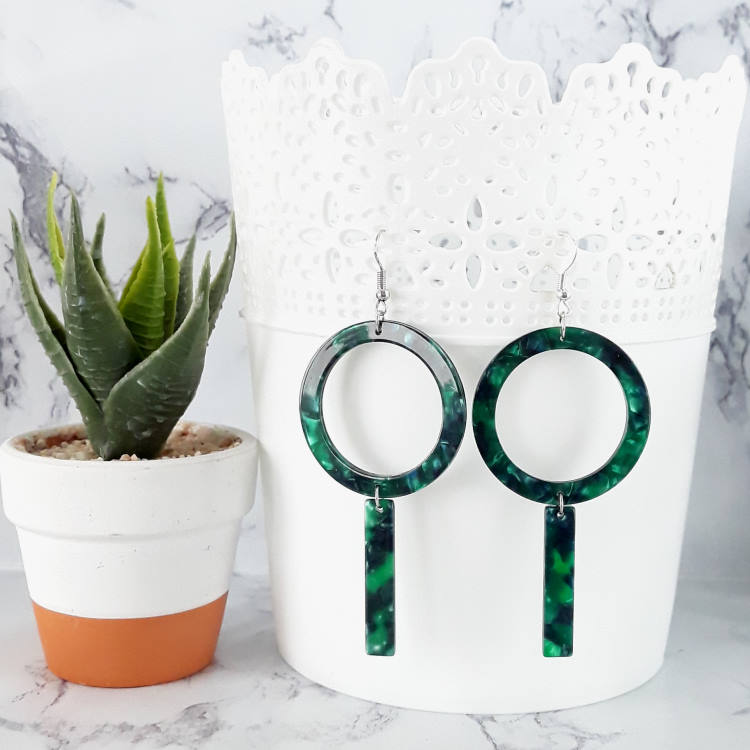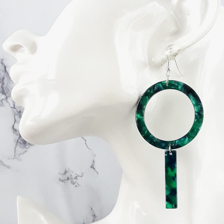 Boucles d'oreilles pendantes graphiques rond et rectangle barre verts marbrés en résine acrylique, pour oreilles percées. Style vintage rétro, géométrique, pour un look tendance et mode.Taille du pendant : 7,5 cm de haut. Matière du pendant : AcryliqueMatière des crochets : Acier inoxydable