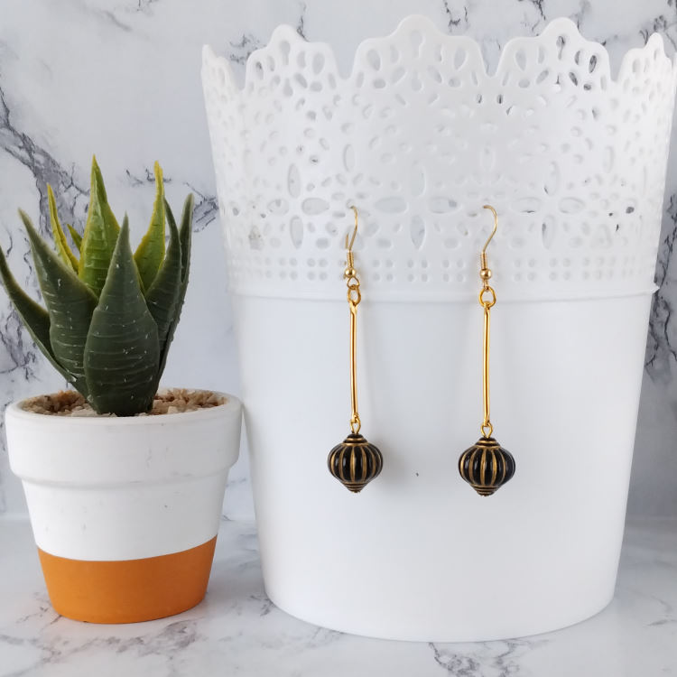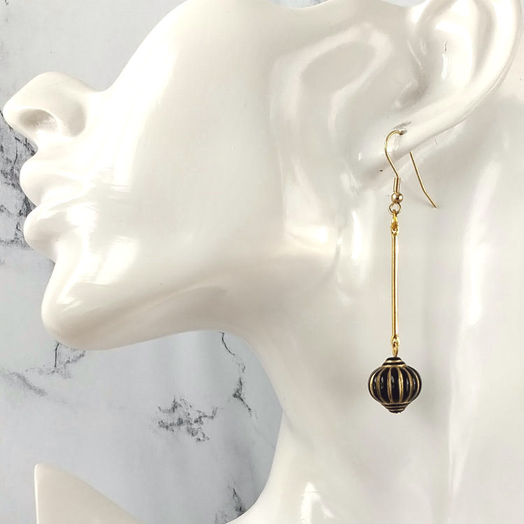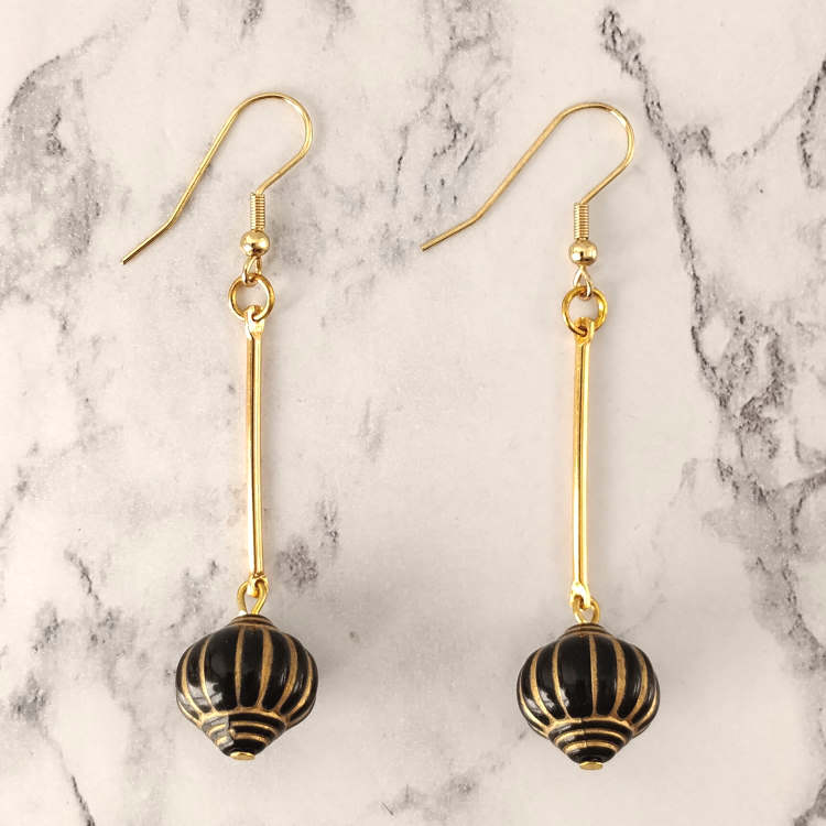 Boucles d'oreilles pendantes perle en forme de lampion japonais noir et tige dorée balancier, pour oreilles percées. Style vintage rétro art déco pour un look tendance.Taille du pendant : 4,5 cm de hautMatière du pendant : Acrylique et laiton plaqué Matière des crochets : Acier inoxydable