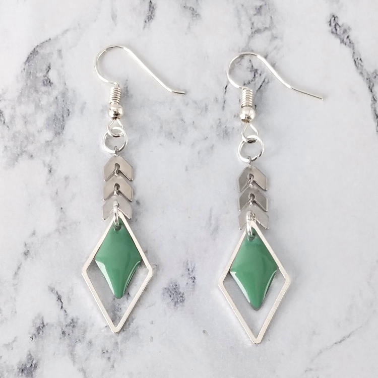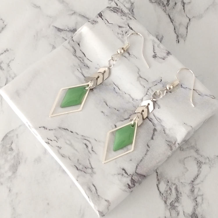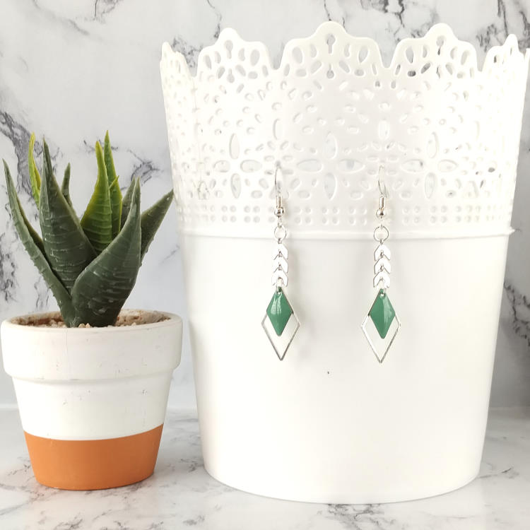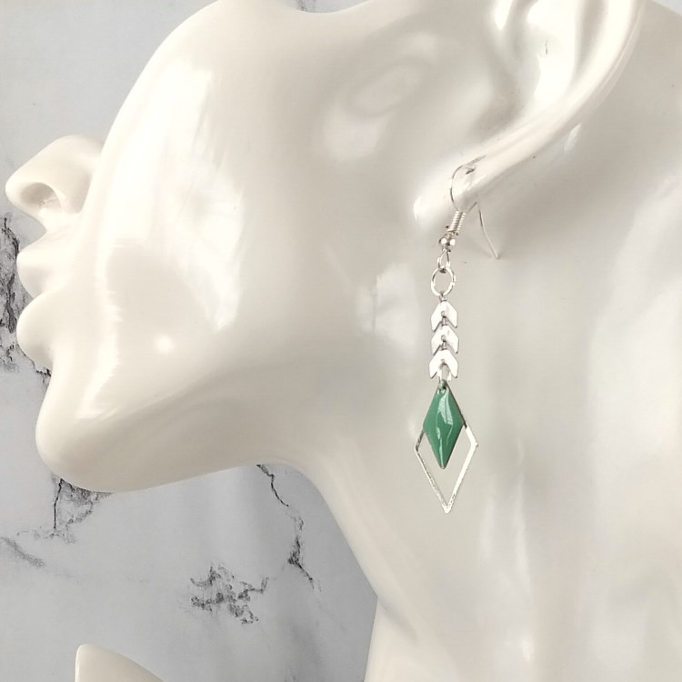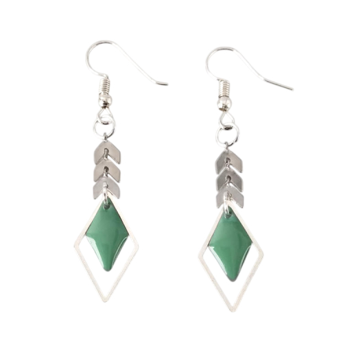 Boucles d'oreilles pendantes épis de blé et losanges vert d'eau émaillé et argenté, pour oreilles percées. Style ethnique pour un look tendance original.Taille du pendant : 4 cm de haut. Matière du pendant : Métal et acryliqueMatière des crochets : Acier inoxydable