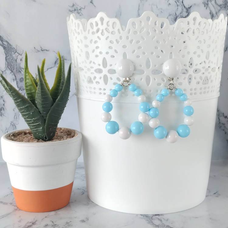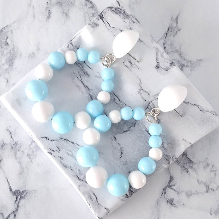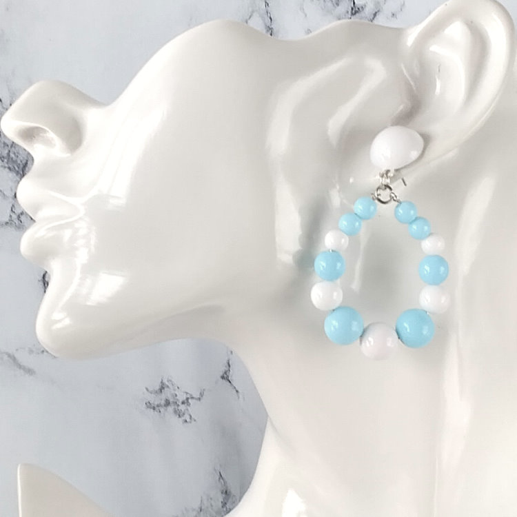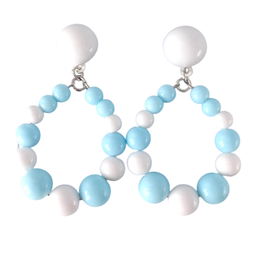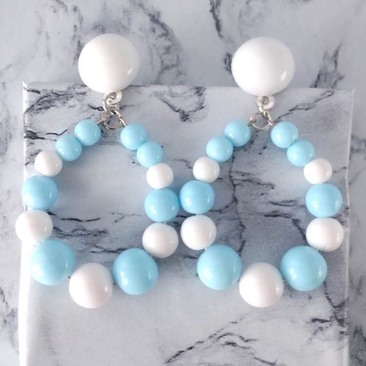 Boucles d'oreilles pendantes avec perles blanches et bleues rondes de différentes tailles qui forment une goutte pendante et cabochon assorti, pour oreilles percées. Style bohème.Super tendance !Taille du pendant : 4,2 cm de hauteur. 3,5 cm de largeur.Matière du pendant : Résine acrylique teintée opaqueMatière des clous : Métal et résine acrylique