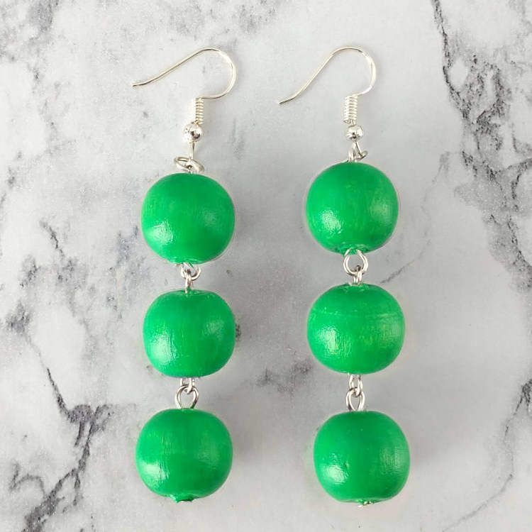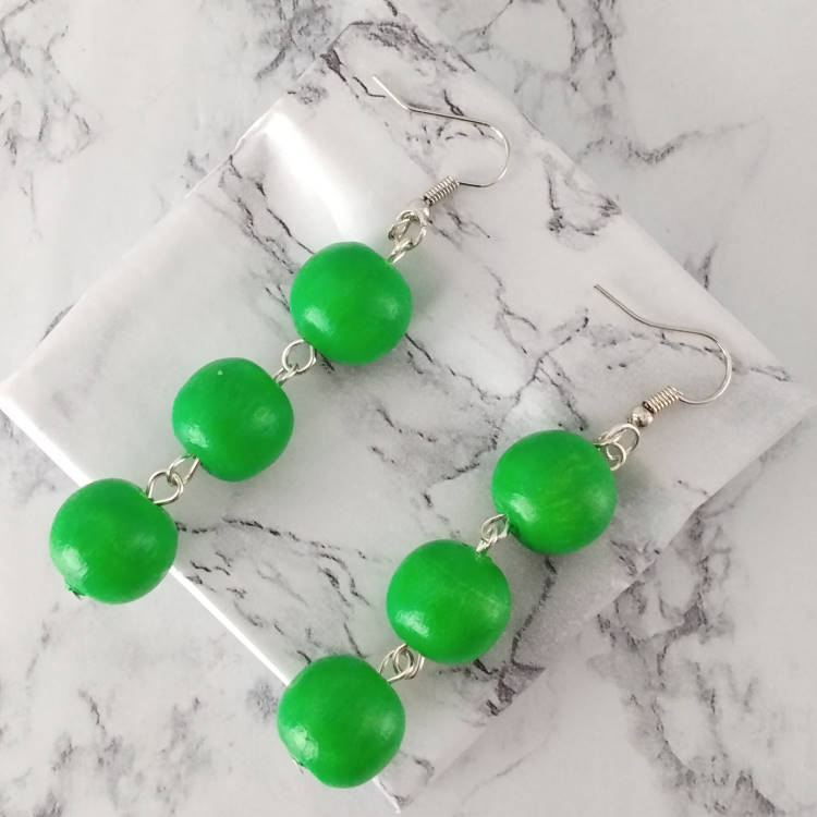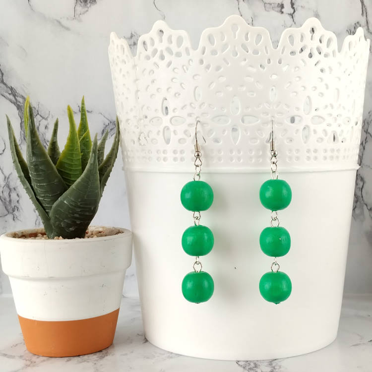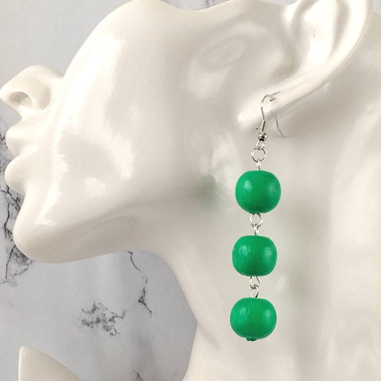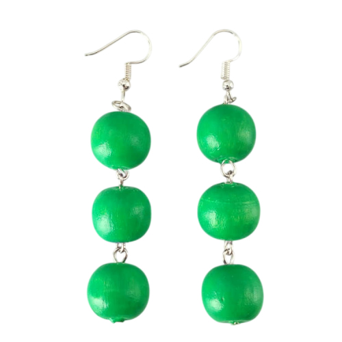 Boucles d'oreilles pendantes grappe de trois perles en bois vert, pour oreilles percées. Style vintage ethnique pour un look tendance retro.Taille du pendant : 5 cm de haut. Matière du pendant : Perles en bois peint et vernisMatière des crochets : Acier inoxydable
