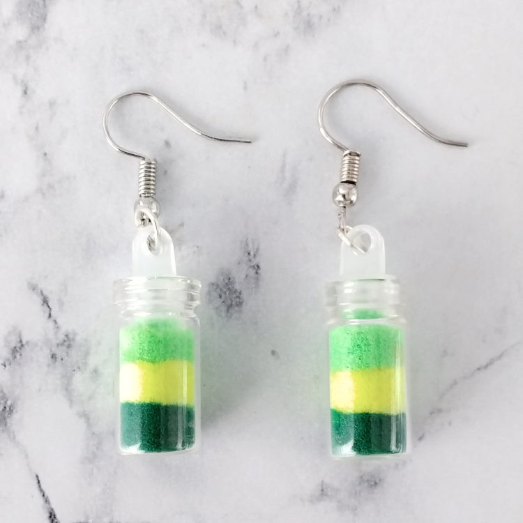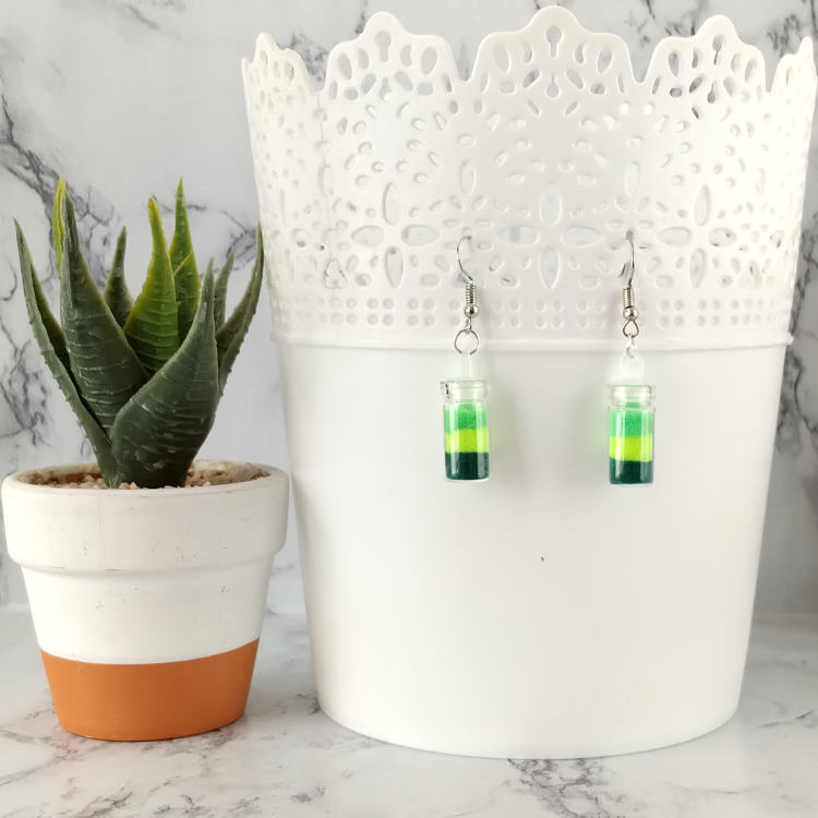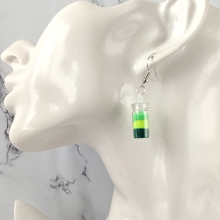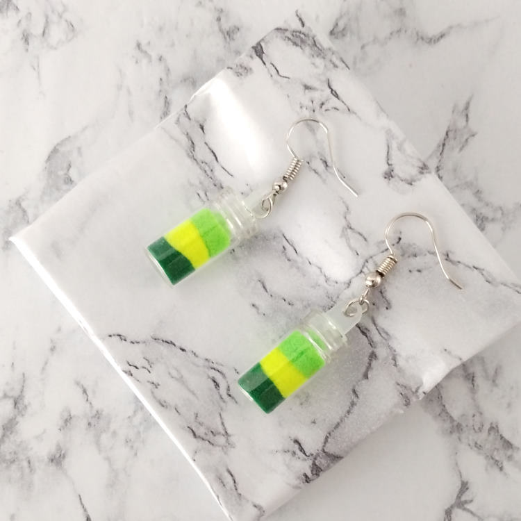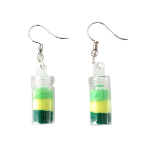 Boucles d'oreilles pendantes petit flacon en verre contenant trois mousses synthétiques colorées en jaune, vert clair et foncé, pour oreilles percées. Le bouchon est en plastique. Original, mignon et amusant.Taille du pendant : 2,3 cm de hauteur. Matière du pendant : Verre, mousse synthétique et plastiqueMatière des crochets : Acier inoxydable