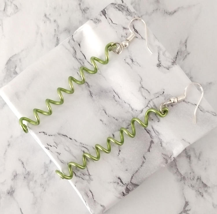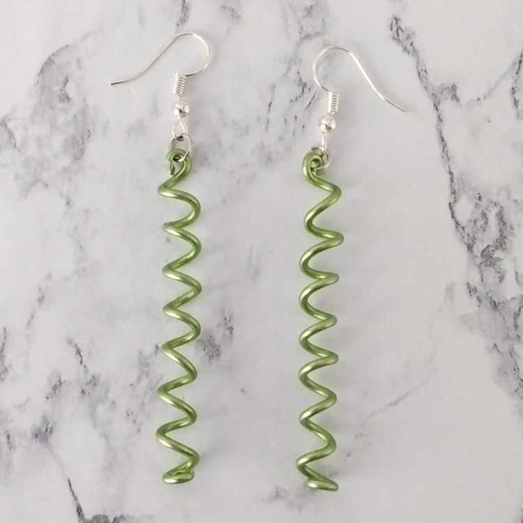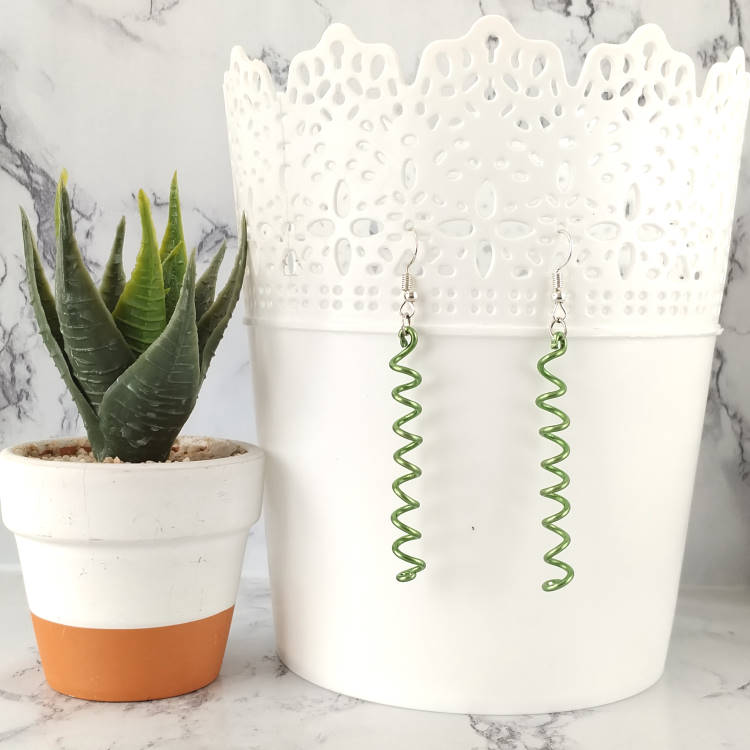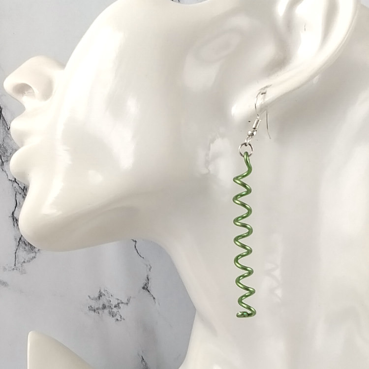 Boucles d'oreilles pendantes longue spirale verte ressemblant à un ressort, pour oreilles percées. Style moderne pour un look tendance original.Taille du pendant : 5 cm de haut. Matière du pendant : AluminiumMatière des crochets : Acier inoxydable