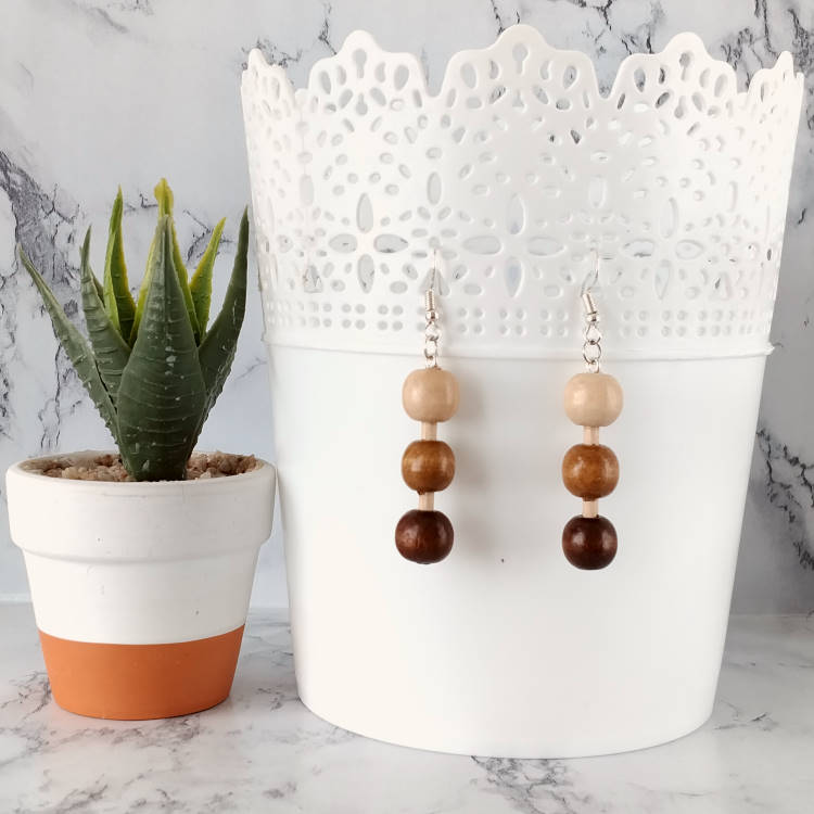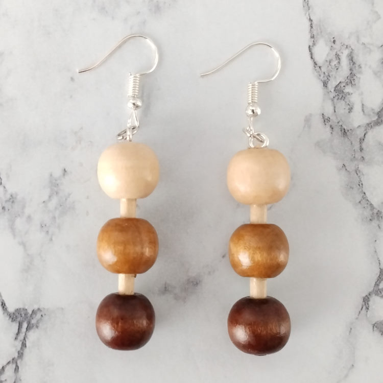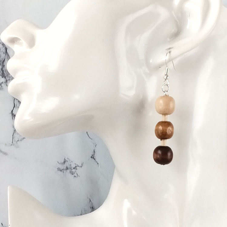 Boucles d'oreilles pendantes de trois perles en bois dégradé marron beige, pour oreilles percées. Style vintage pour un look tendance retro original.Taille du pendant : 4 cm de haut. Matière du pendant : Perles en bois vernisMatière des crochets : Acier inoxydable