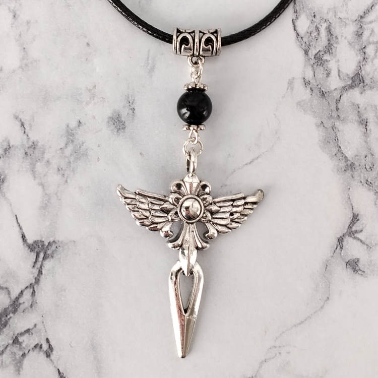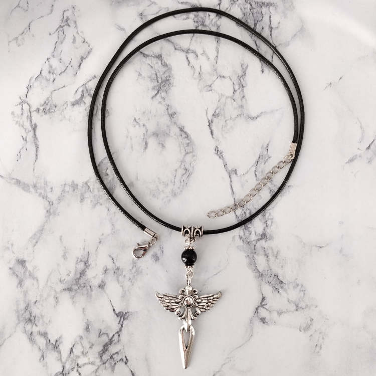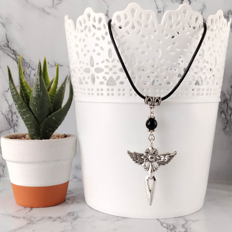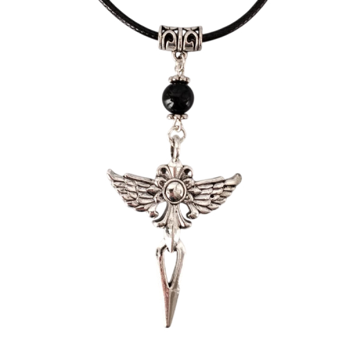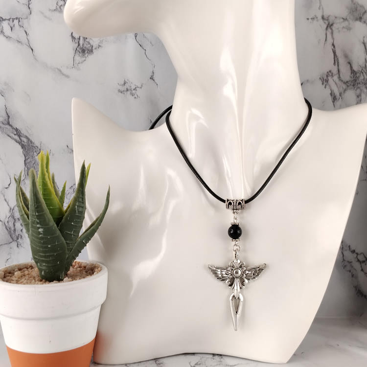 Collier ailes d'ange épée argentée et perle noire montée sur cordon en cuir noir tressé, réglable grâce à sa chaine de rallonge.Style gothiqueTaille du collier : 60 à 65 cm de longueurTaille du pendant : 6,5 cm de hauteur. Matière du collier : Cuir et acier inoxydable (fermoir et chaine de rallonge)Matière du pendant : Métal