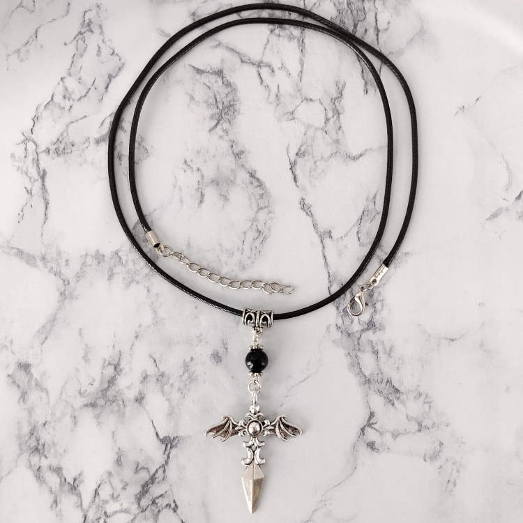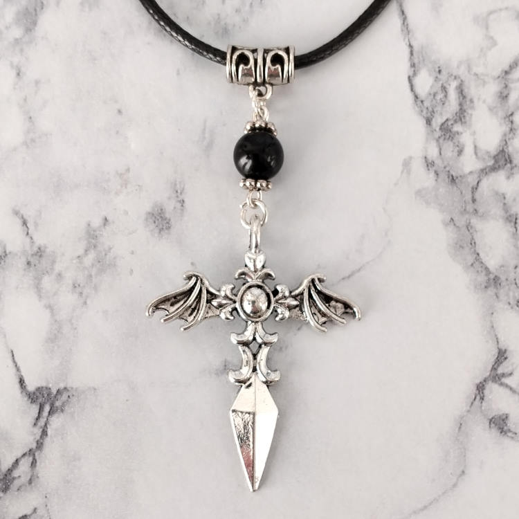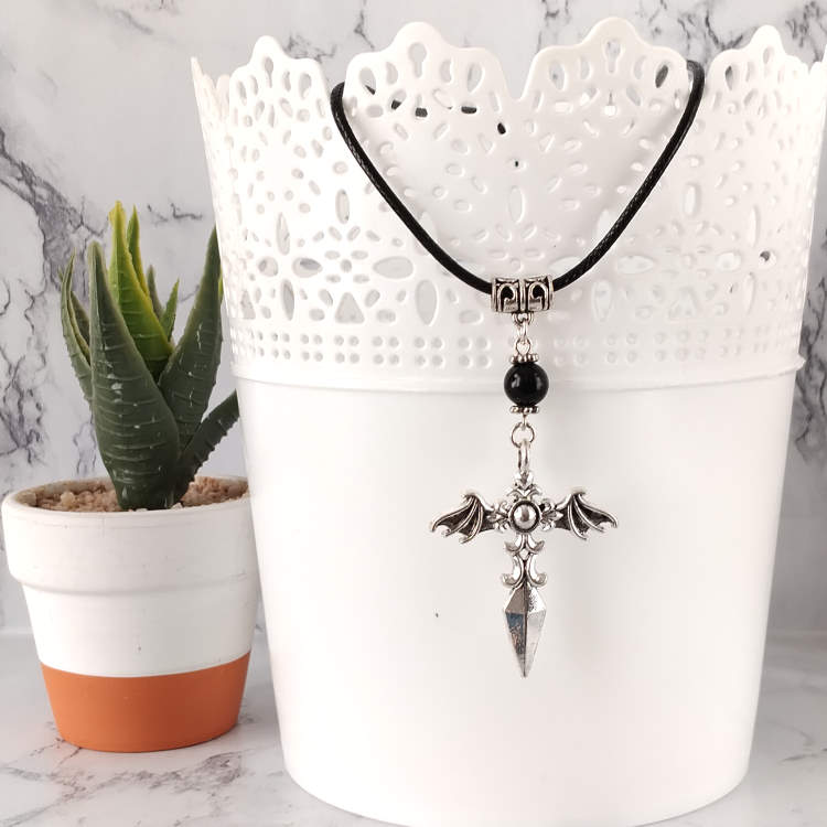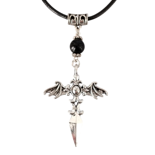 Collier ailes vampire diabolique épée argentée et perle noire montée sur cordon en cuir noir tressé, réglable grâce à sa chaine de rallonge.Style gothiqueTaille du collier : 60 à 65 cm de longueurTaille du pendant : 6 cm de hauteur. Matière du collier : Cuir et acier inoxydable (fermoir et chaine de rallonge)Matière du pendant : Métal