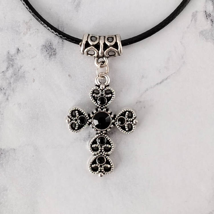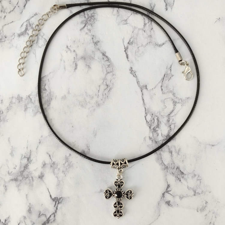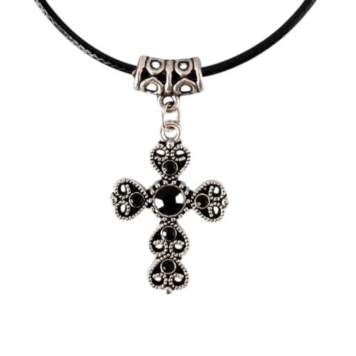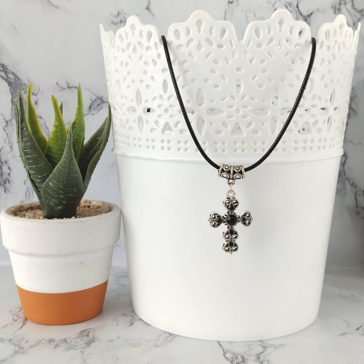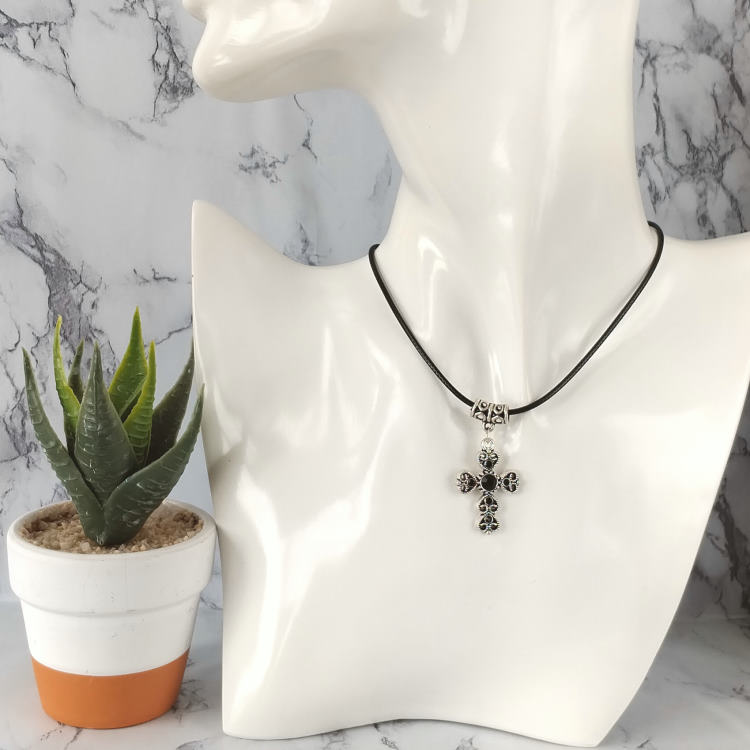 Collier croix argentée strass noir montée sur cordon en cuir noir tressé, réglable grâce à sa chaine de rallonge.Taille du collier : 45 à 50 cm de longueurTaille du pendant : 2,7 cm de hauteur. Matière du collier : Cuir et acier inoxydable (fermoir et chaine de rallonge)Matière du pendant : Métal