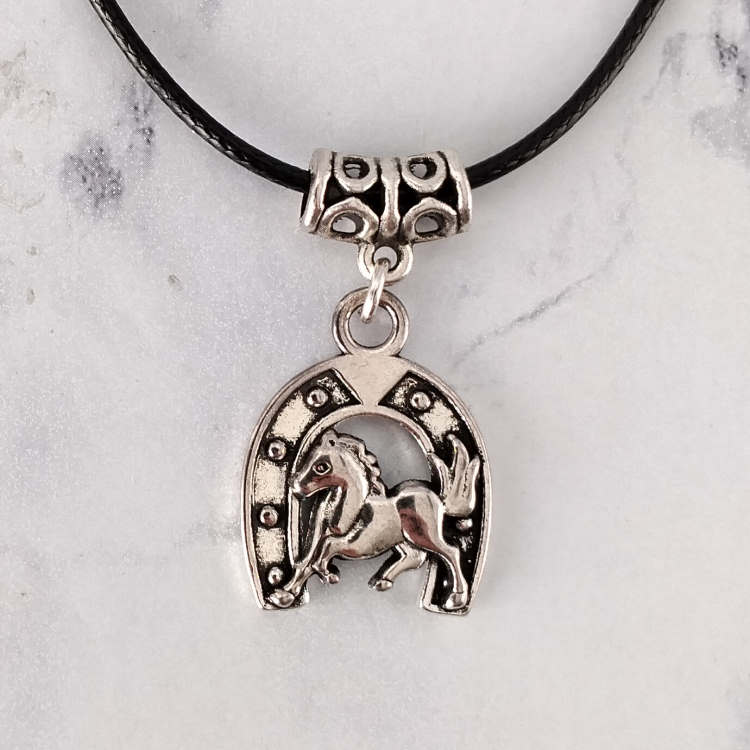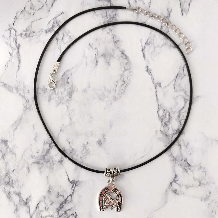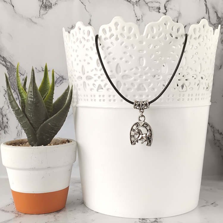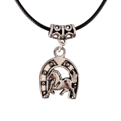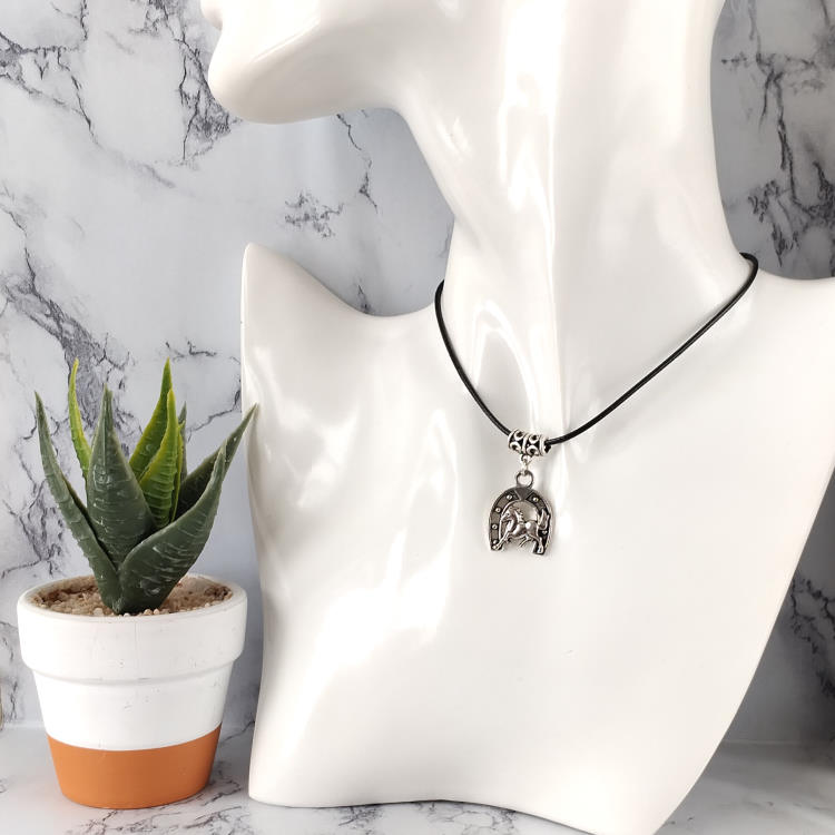 Collier fer à cheval argenté monté sur cordon en cuir noir tressé, réglable grâce à sa chaine de rallonge. Porte bonheur.Taille du collier : 45 à 50 cm de longueurTaille du pendant : 2,2 cm de hauteur. Matière du collier : Cuir et acier inoxydable (fermoir et chaine de rallonge)Matière du pendant : Métal