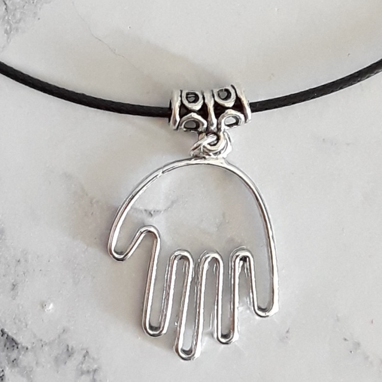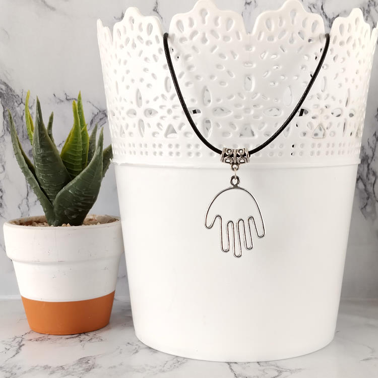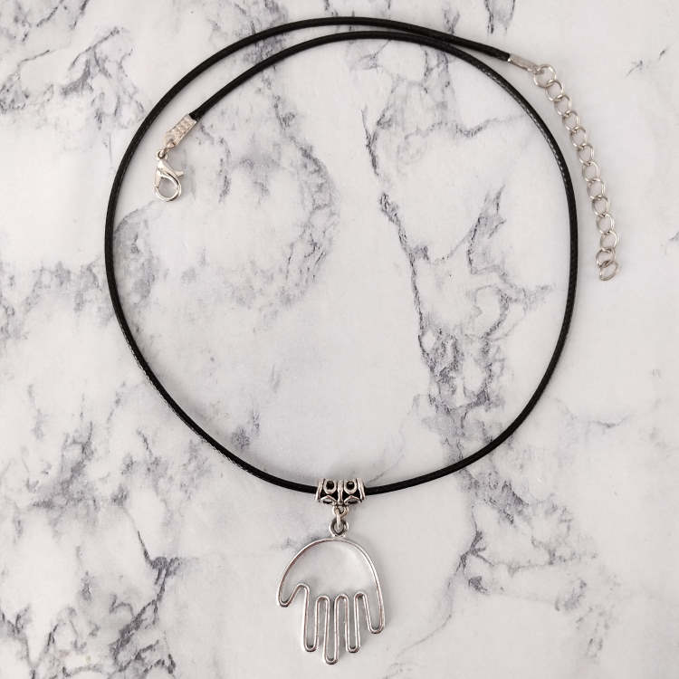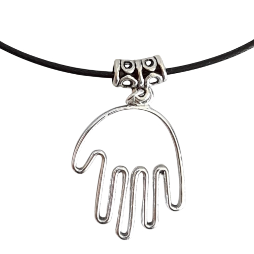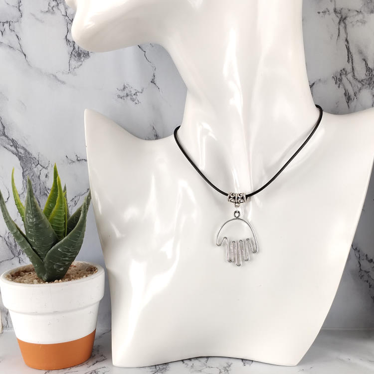 Collier main argentée montée sur cordon en cuir noir tressé, réglable grâce à sa chaine de rallonge. Taille du collier : 45 à 50 cm de longueurTaille du pendant : 3,2 cm de hauteur. Matière du collier : Cuir et acier inoxydable (fermoir et chaine de rallonge)Matière du pendant : Métal